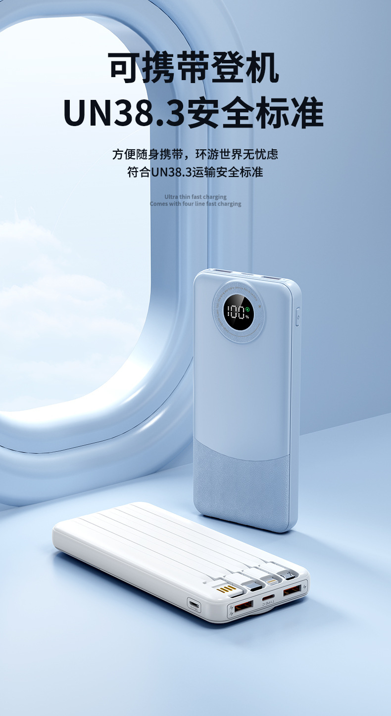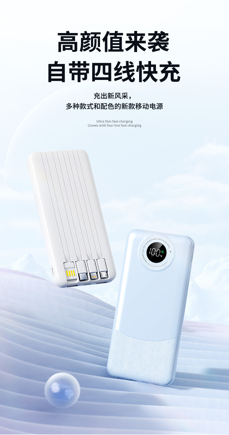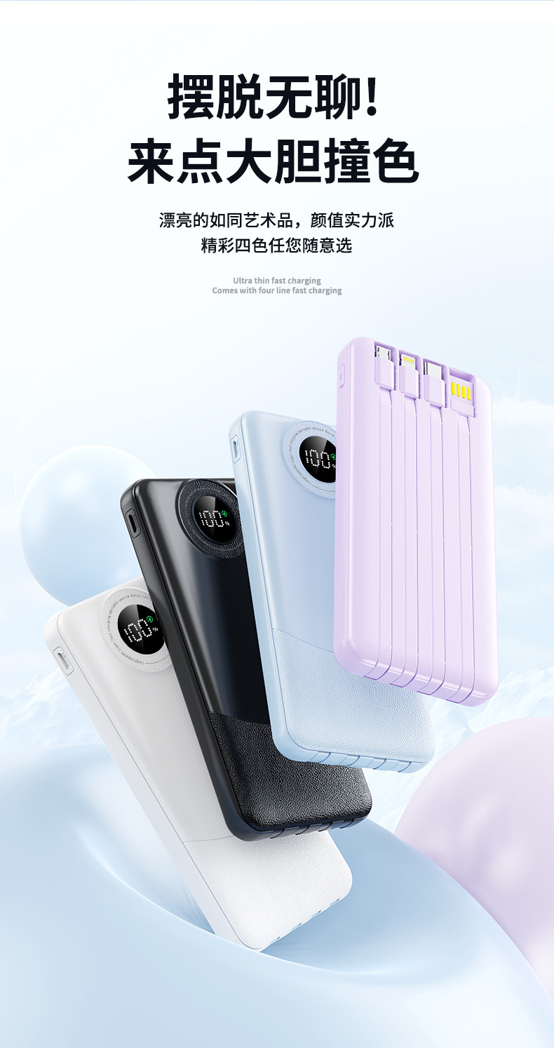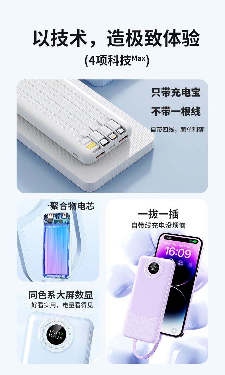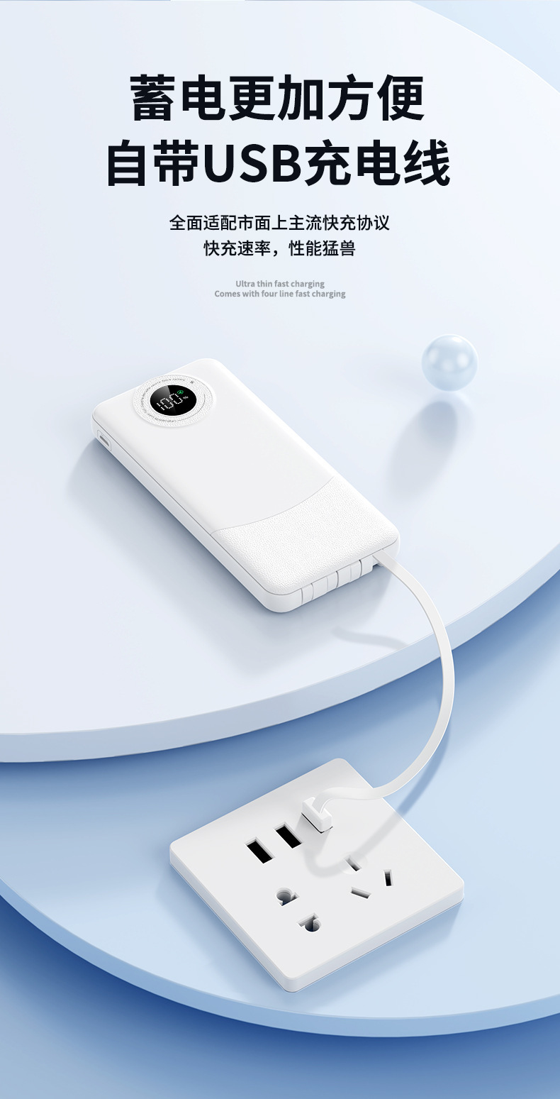 新款超薄大容量充电宝10000毫安快充自带线便携移动电源3C认证