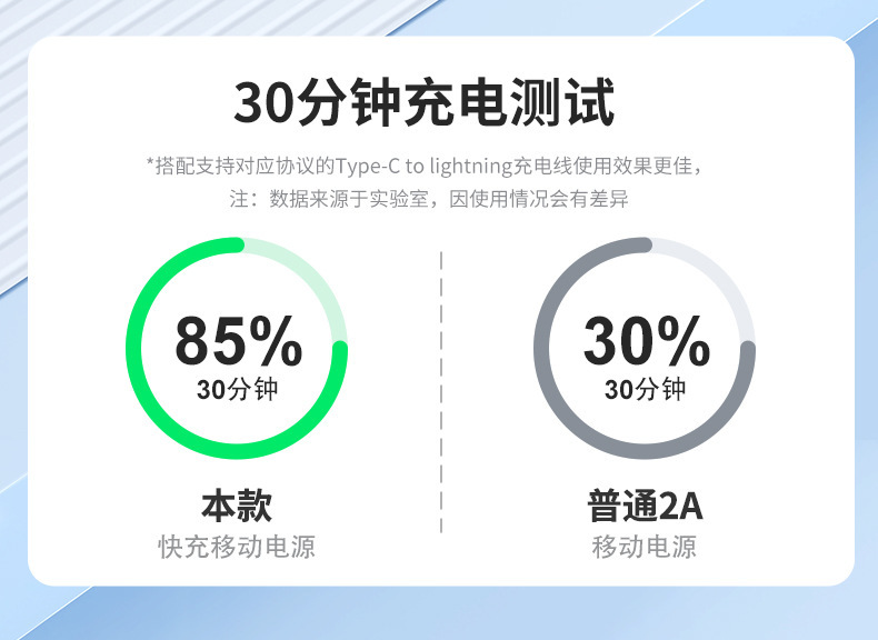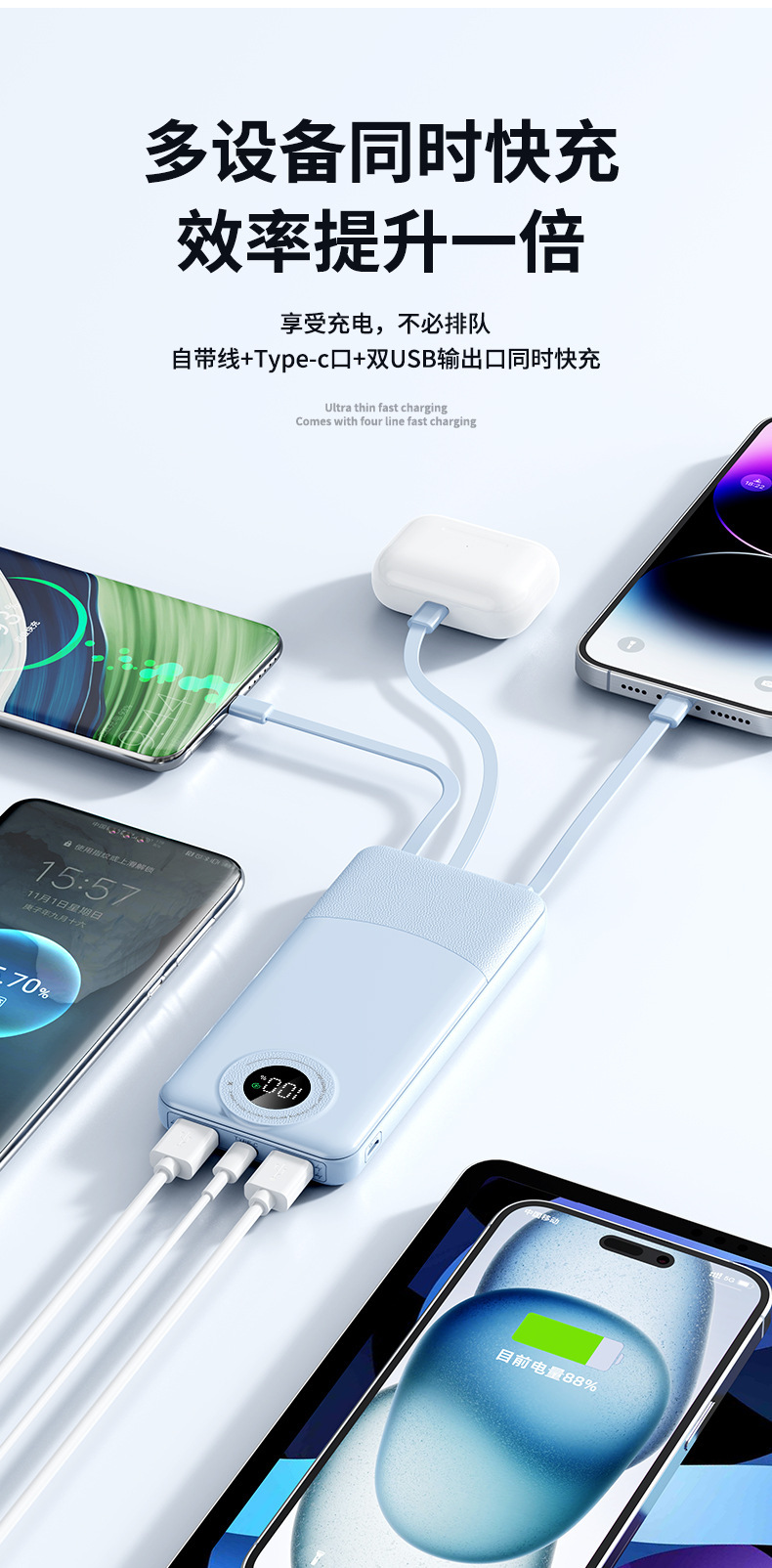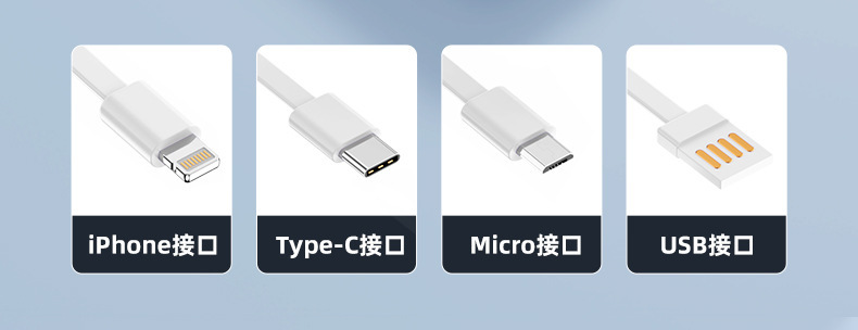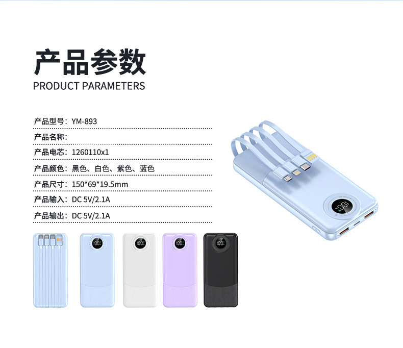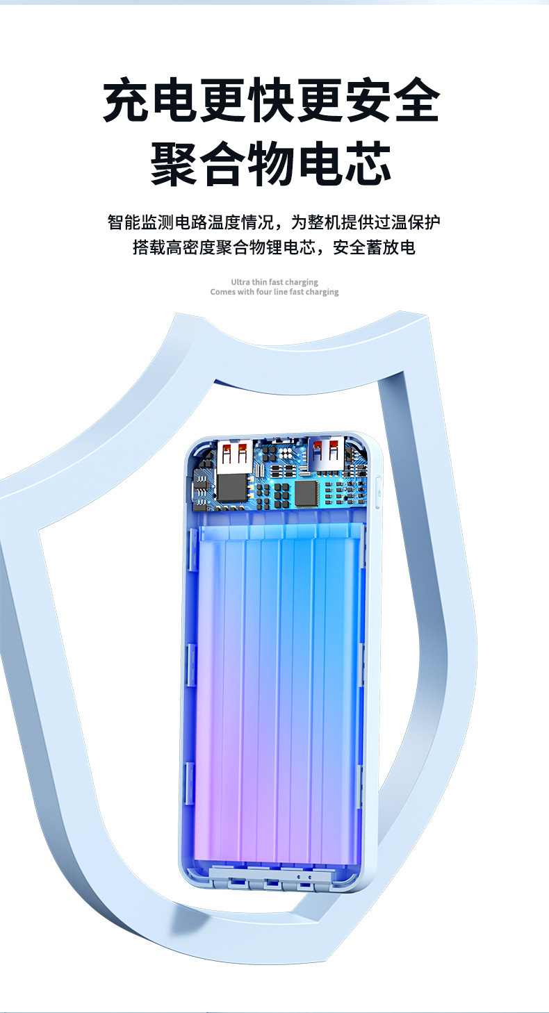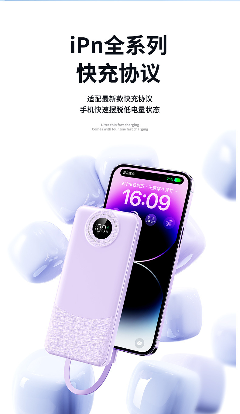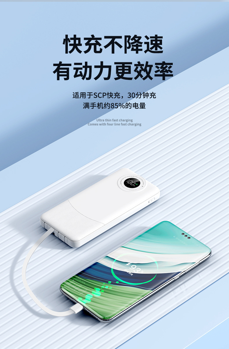 新款超薄大容量充电宝10000毫安快充自带线便携移动电源3C认证
