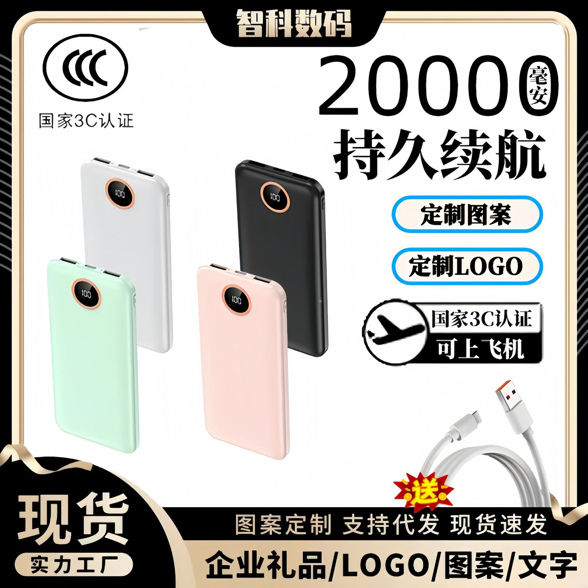 充电宝3C认证可上飞机20000毫安超大容量超薄移动电源power bank
