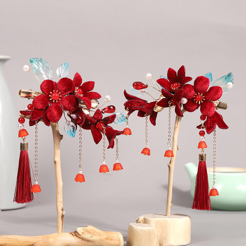 子供の髪飾りの赤いベルベットのヘアピンの王女のドレスの髪飾りの新年の春の祝日の時計の演出の花の子供の漢服の髪飾り