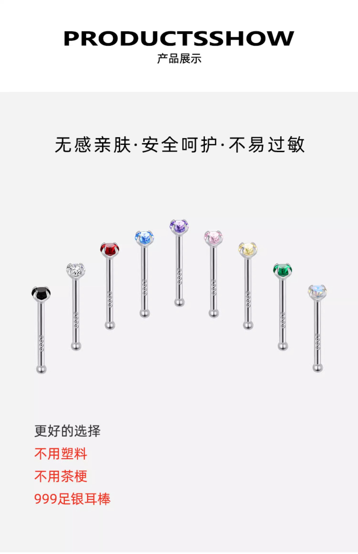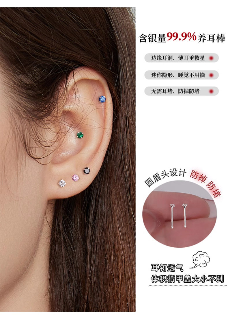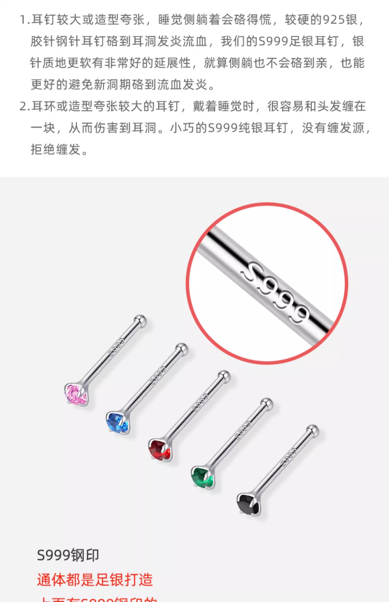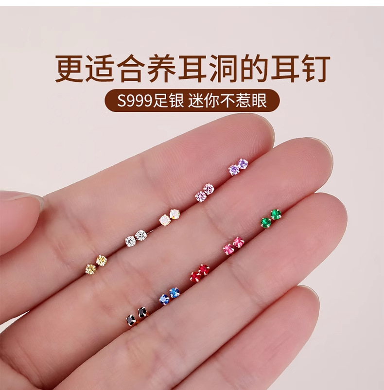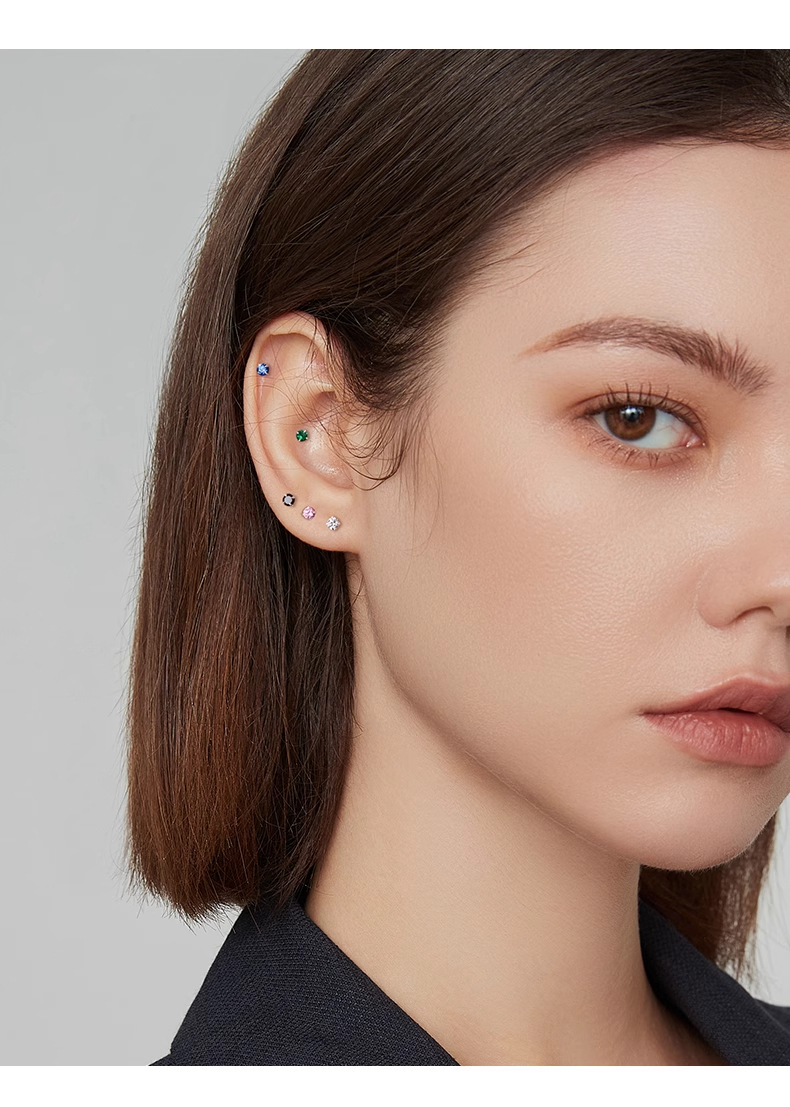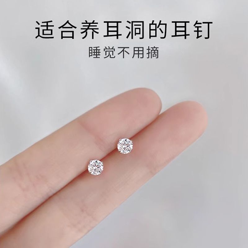 耳穴999純銀超フラッシュジルコンピアス女性ミニ四爪ドリル耳骨釘足銀耳棒精緻耳飾り