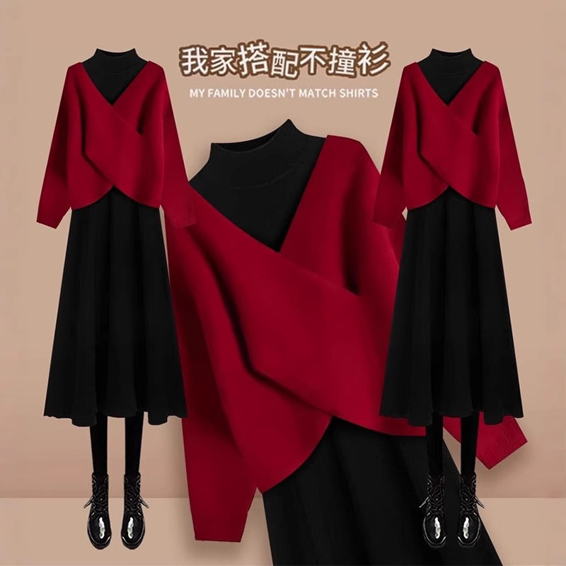 フランスの高級感vネック新年セーター高襟ワンピースニット二点セット