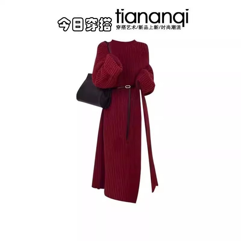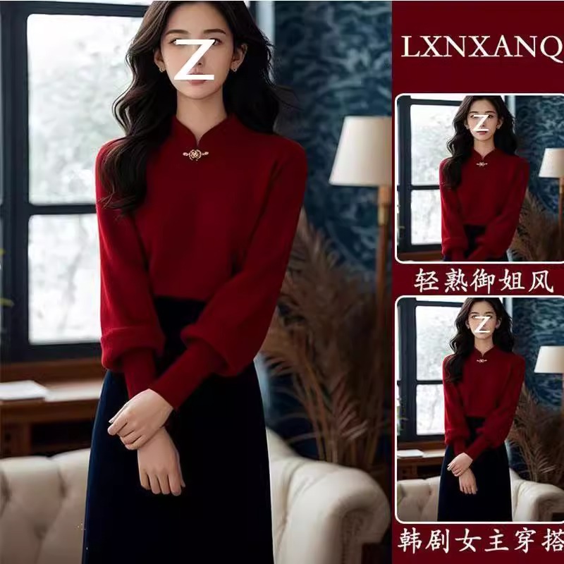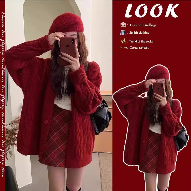 2025セットの女性の春の新型の正月の雰囲気は赤いニットを着ています。