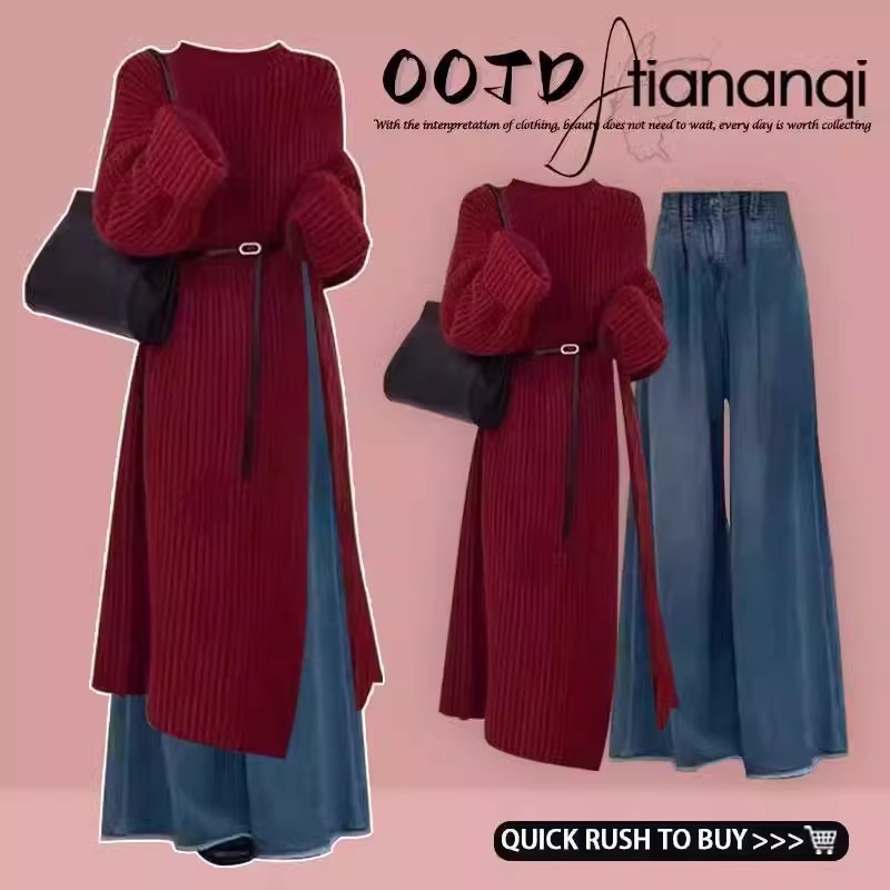 春のお茶系は女装セットの新型高級感温柔風赤いセーターを着てジーンズを2セット着ます。