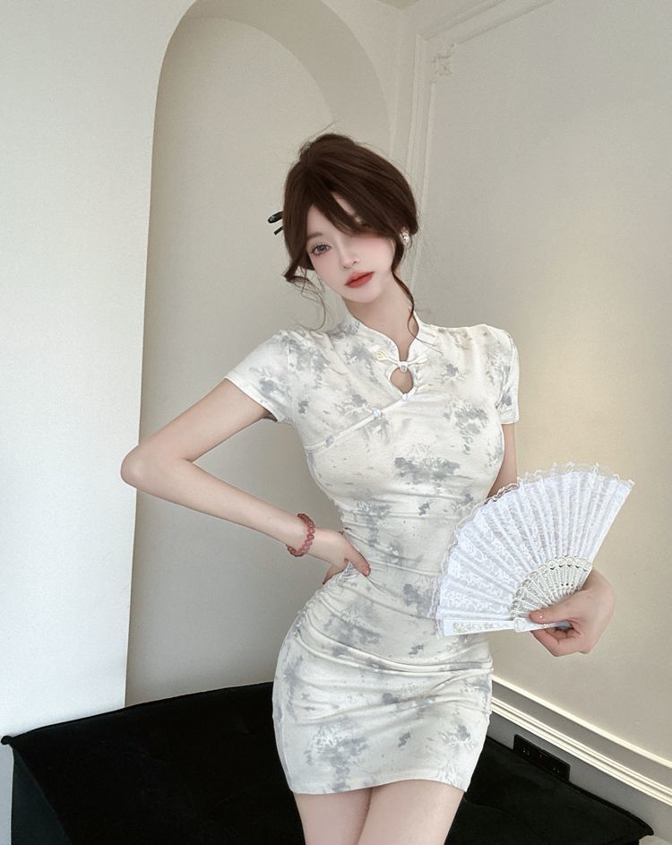 2025年夏季新款新中式国风年轻款改良印花旗袍短款紧身包臀连衣裙