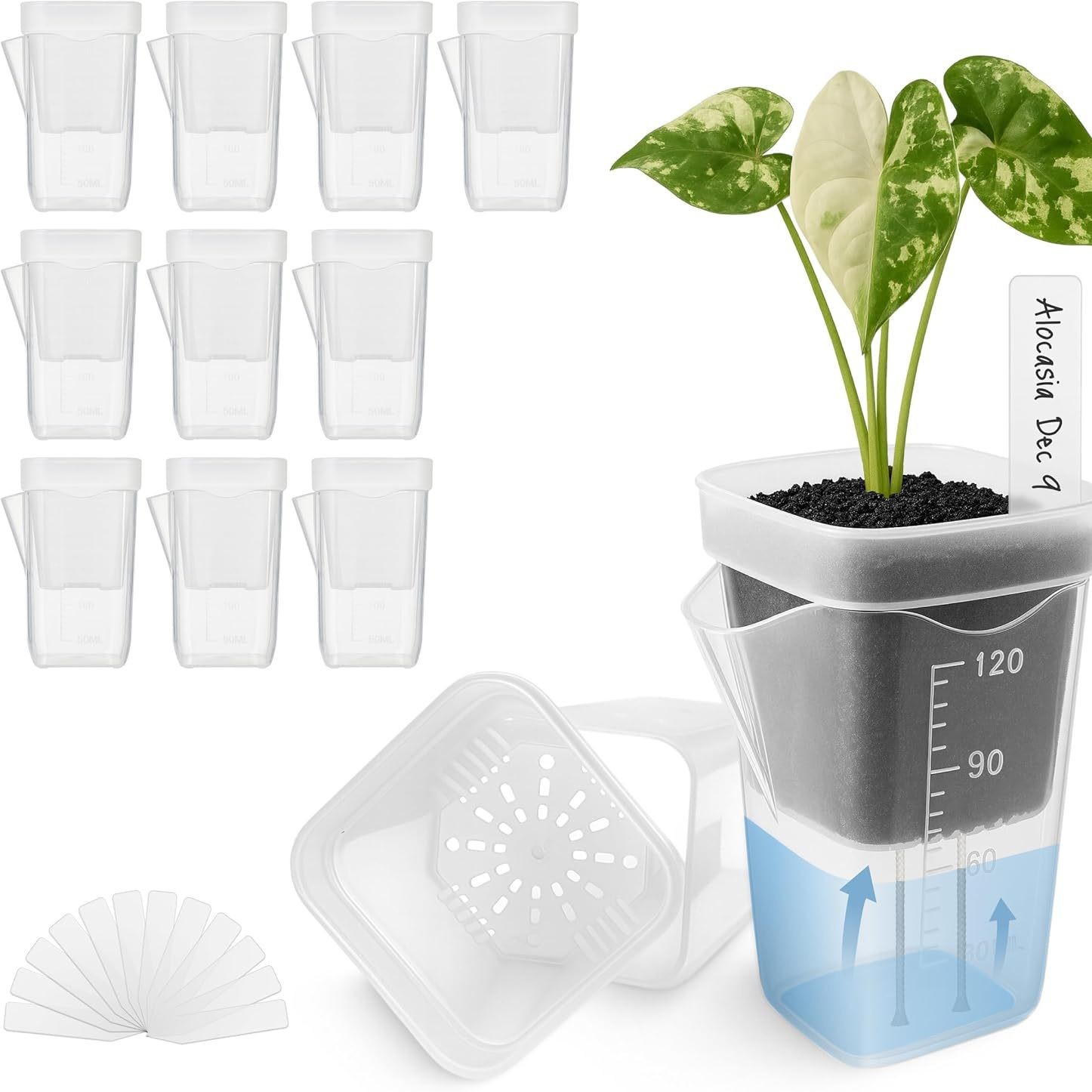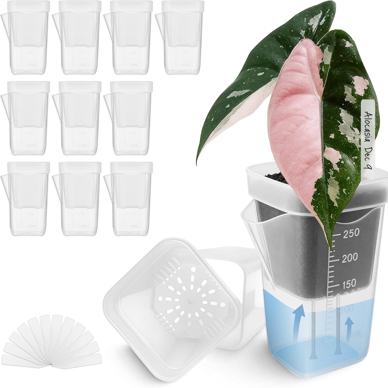 厚い半透明の水耕栽培の低い方の多肉のプラスチックの植木鉢の植物の鉢植えの白い目盛りの計量カップの線は鉢の小さい方を吸います。