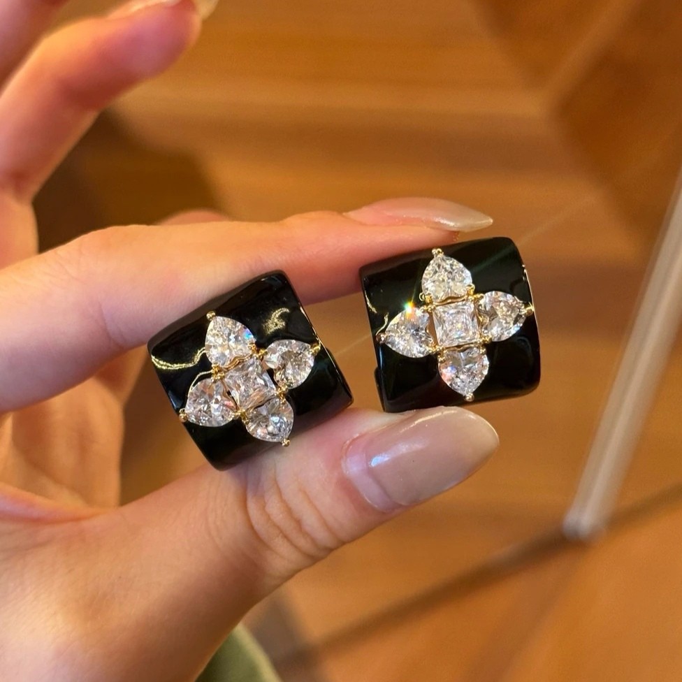 老钱风老花耳环轻奢高级感复古珐琅彩锆石耳饰四叶草气质百搭耳钉