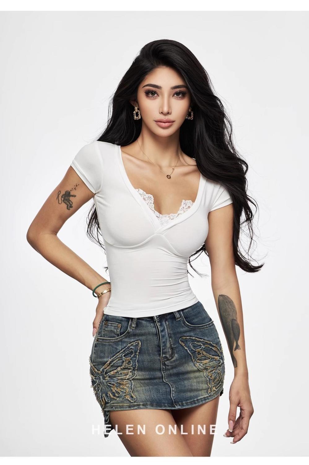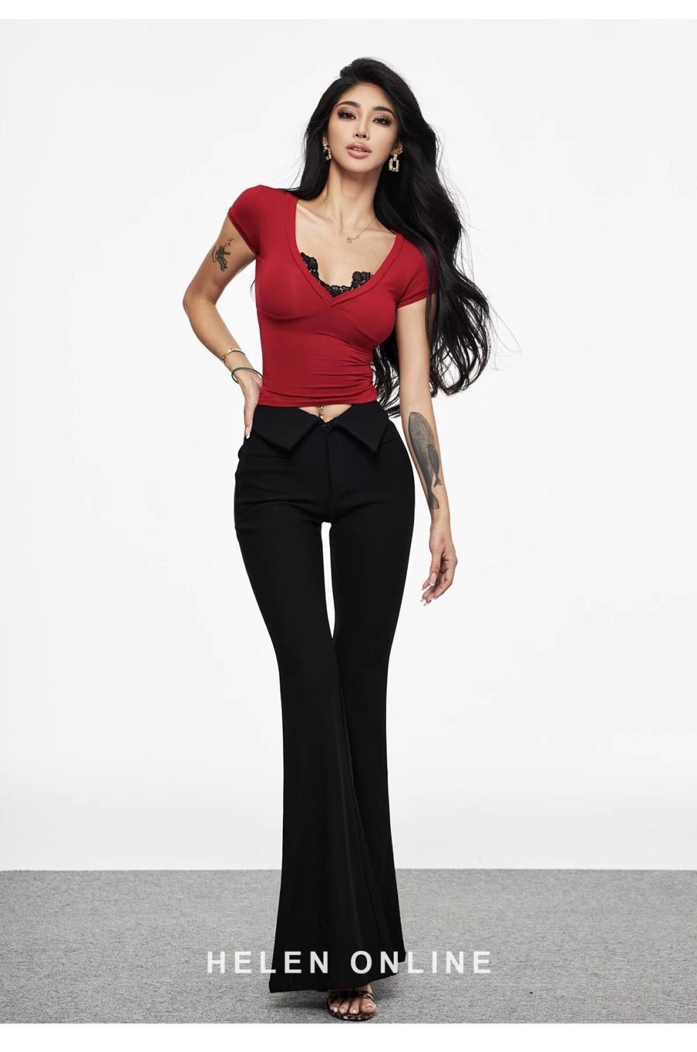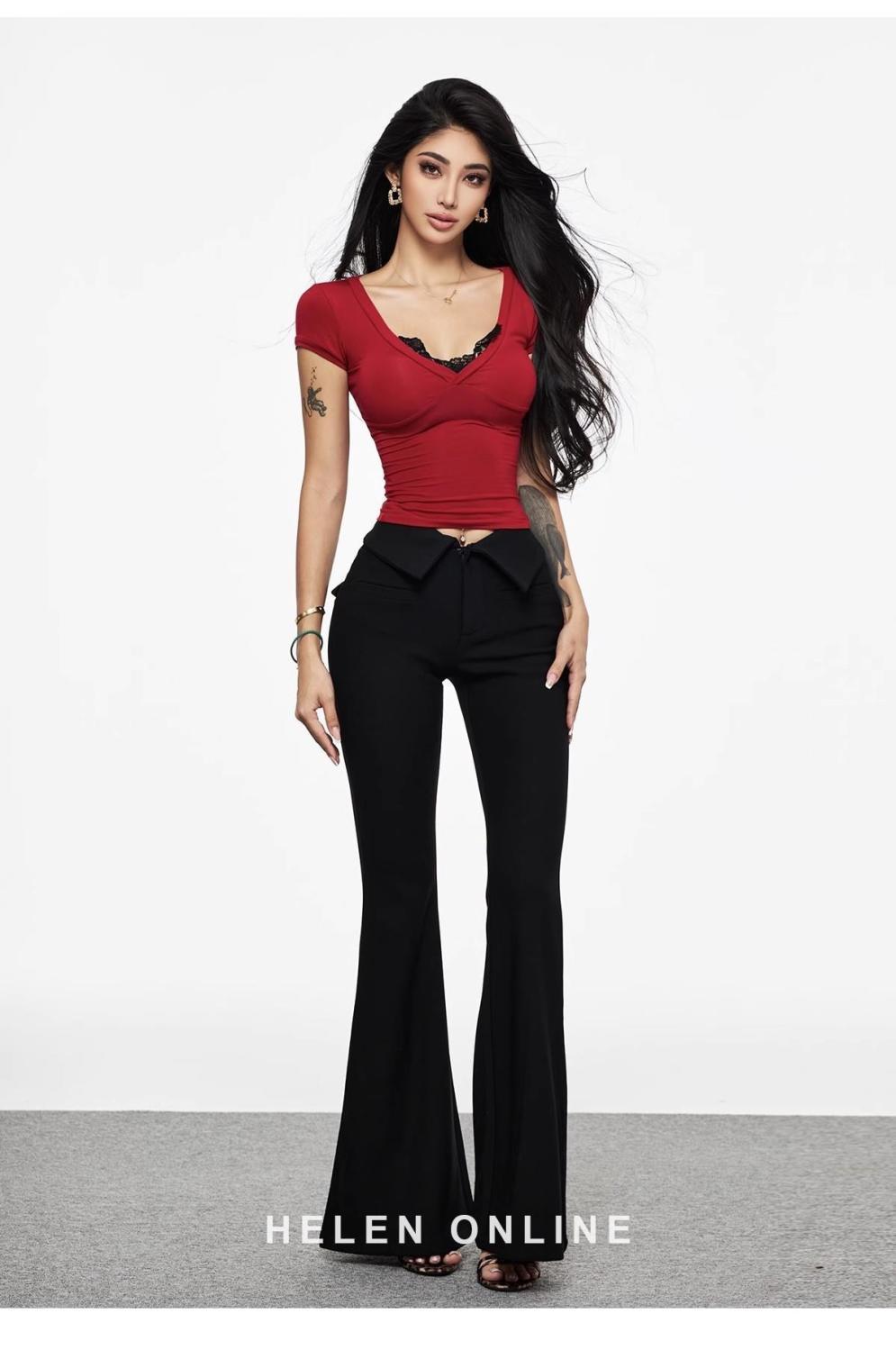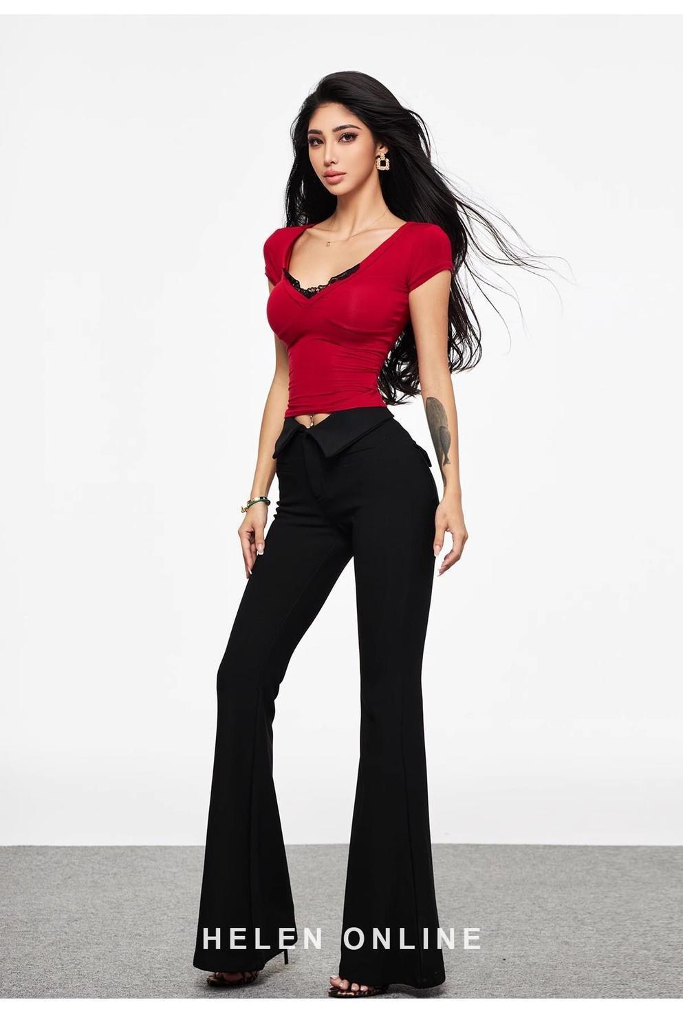 セクシーなギャルの赤いvネックの肩の半袖のtシャツの女性の夏の新型のガードルはやせています。