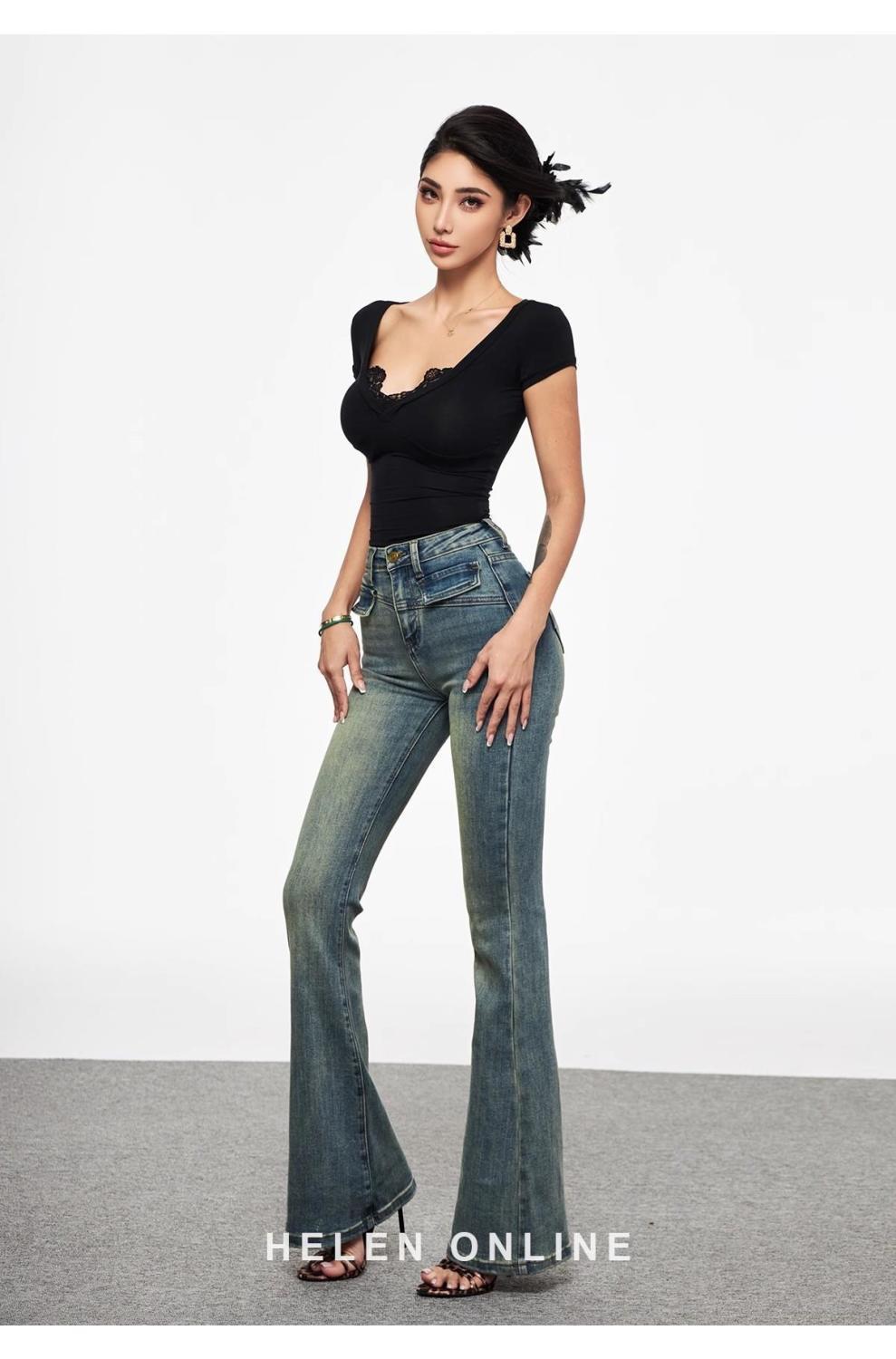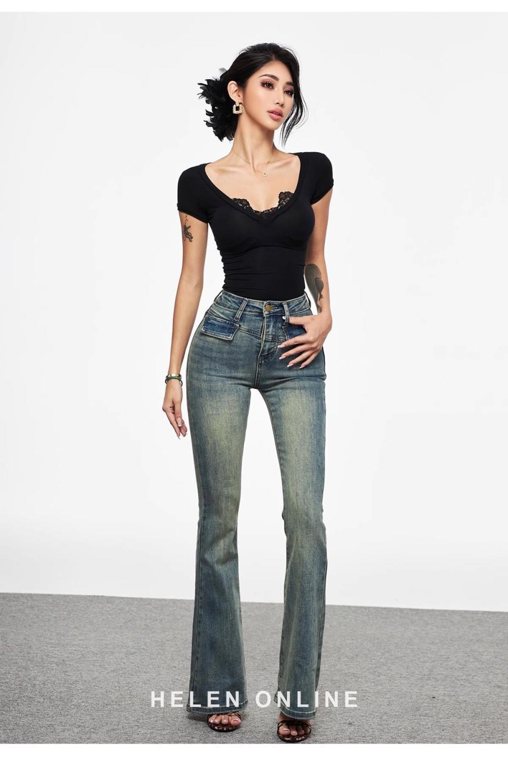 アメリカ式のシワの花vネックの長袖のtシャツの女性の春の新型の甘辛い風の修身はやせている短いタイプの上で服を着ます。