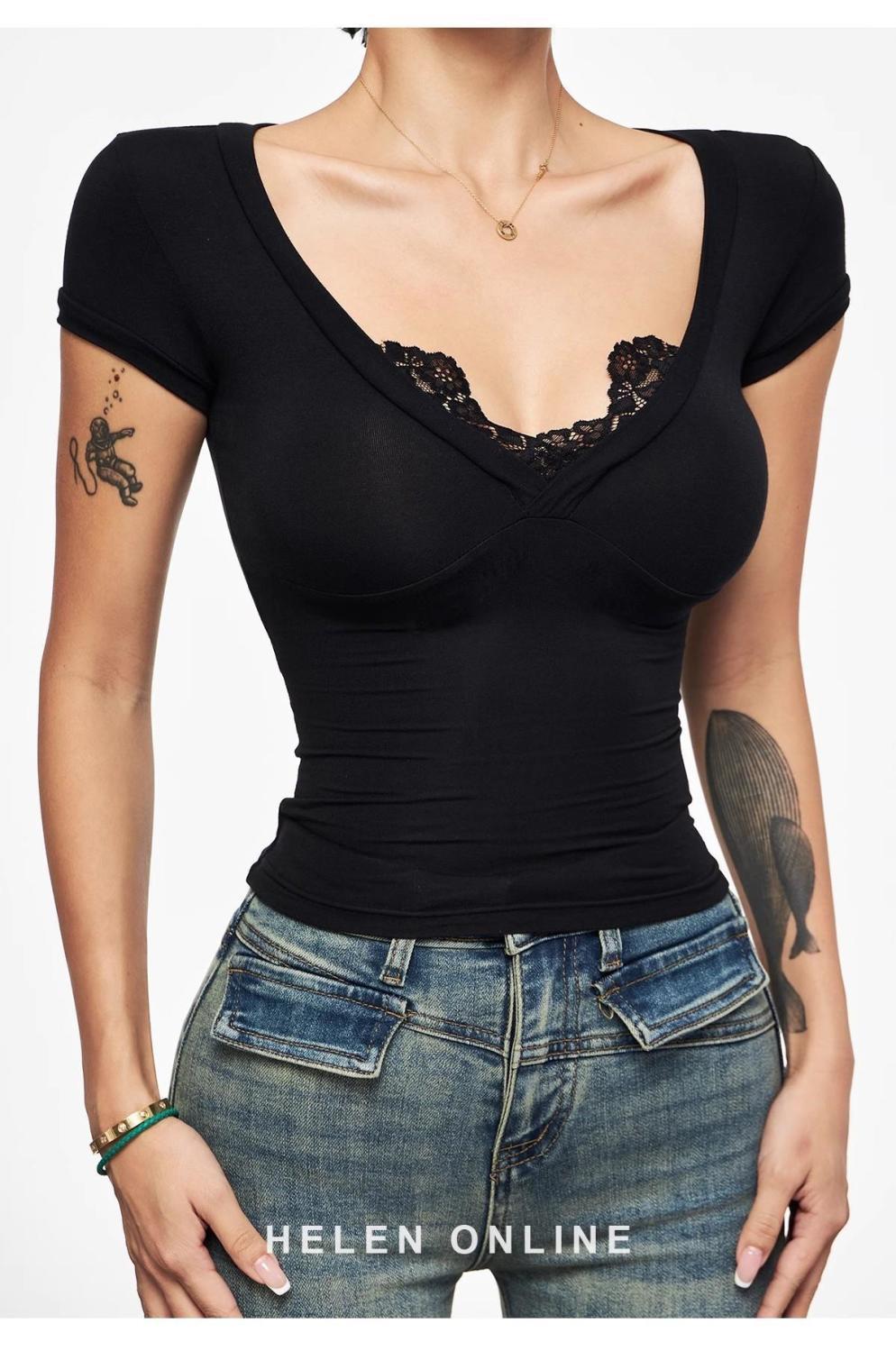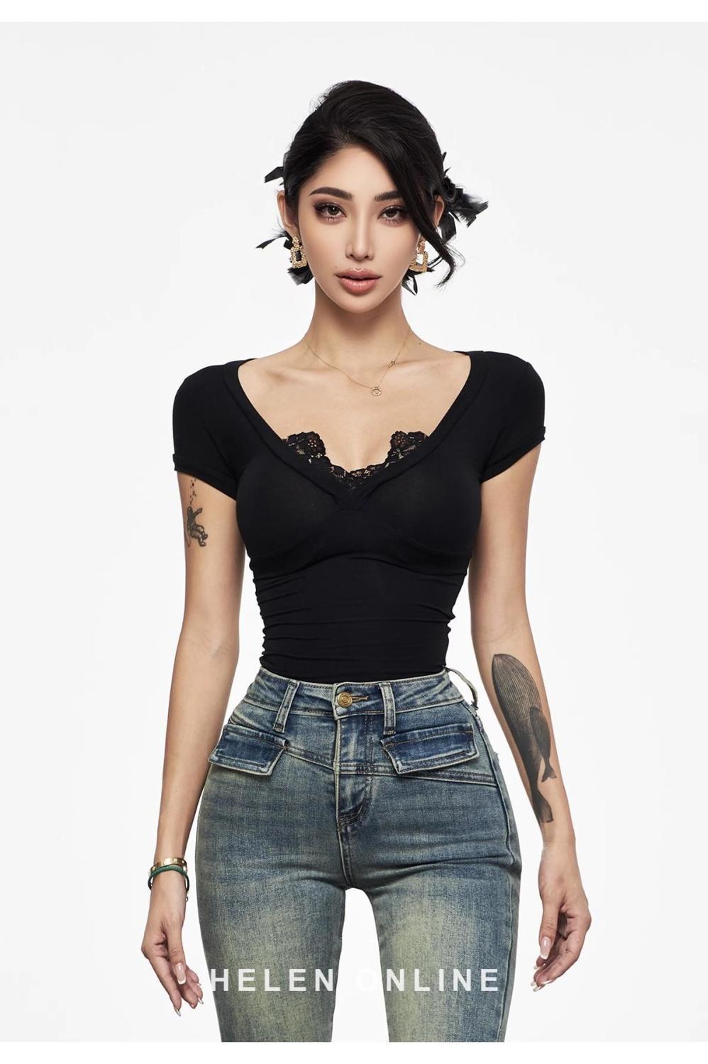 アメリカのセクシーなギャルの黒いvネックの肩の半袖のtシャツの女性の夏の新型の修身はやせている短いタイプの臍の上着を現します。