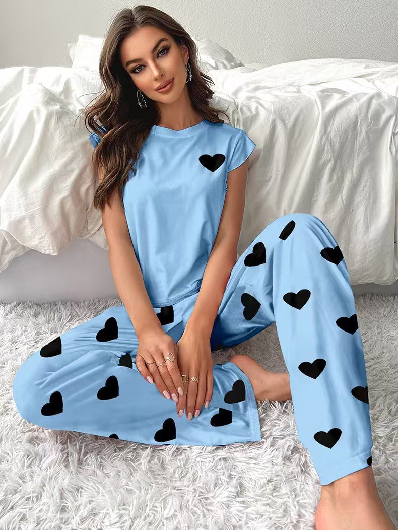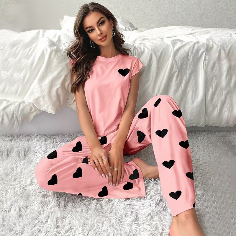 欧美爆款跨境爱心印花甜美短袖长裤套装睡衣家居服