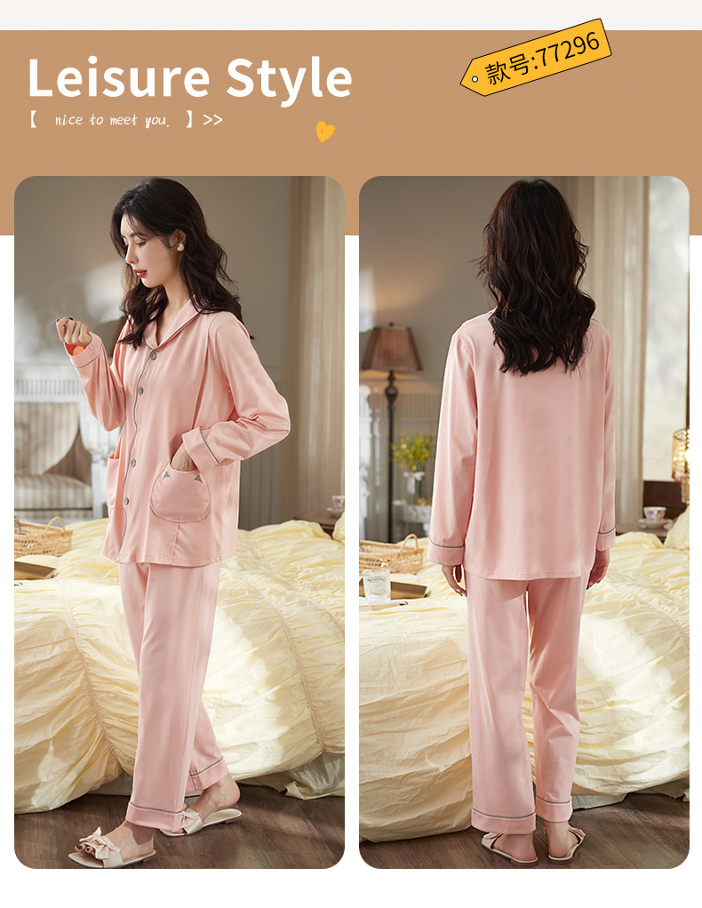 睡衣女100%纯棉春秋款纯色秋季长袖长裤开衫女士大码可外穿家居服