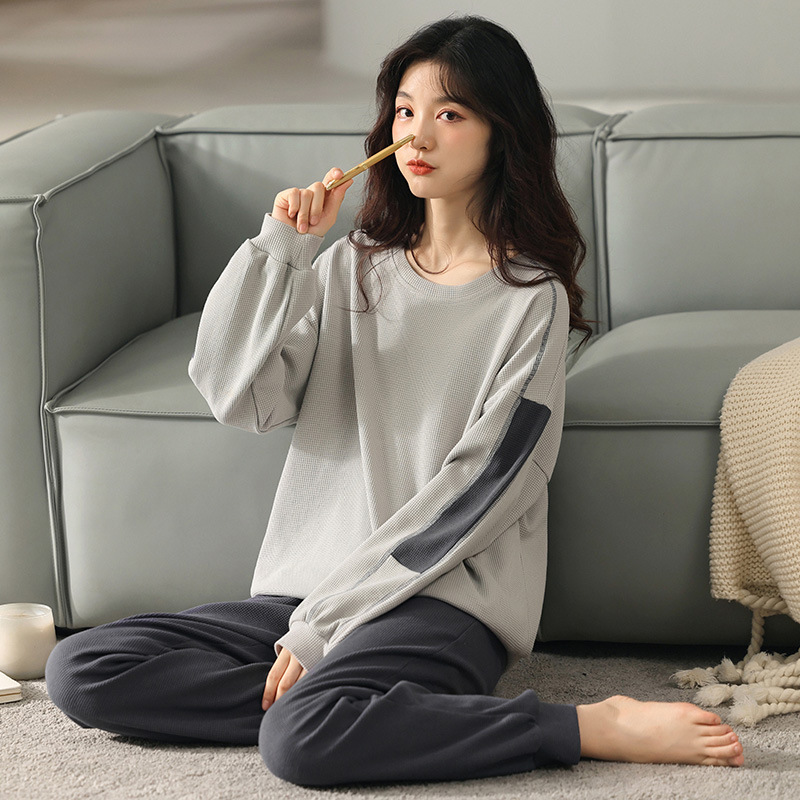 ワッフル全綿パジャマ女性春秋純綿新型冬長袖高級家庭服は韓国版スーツを着ることができます。