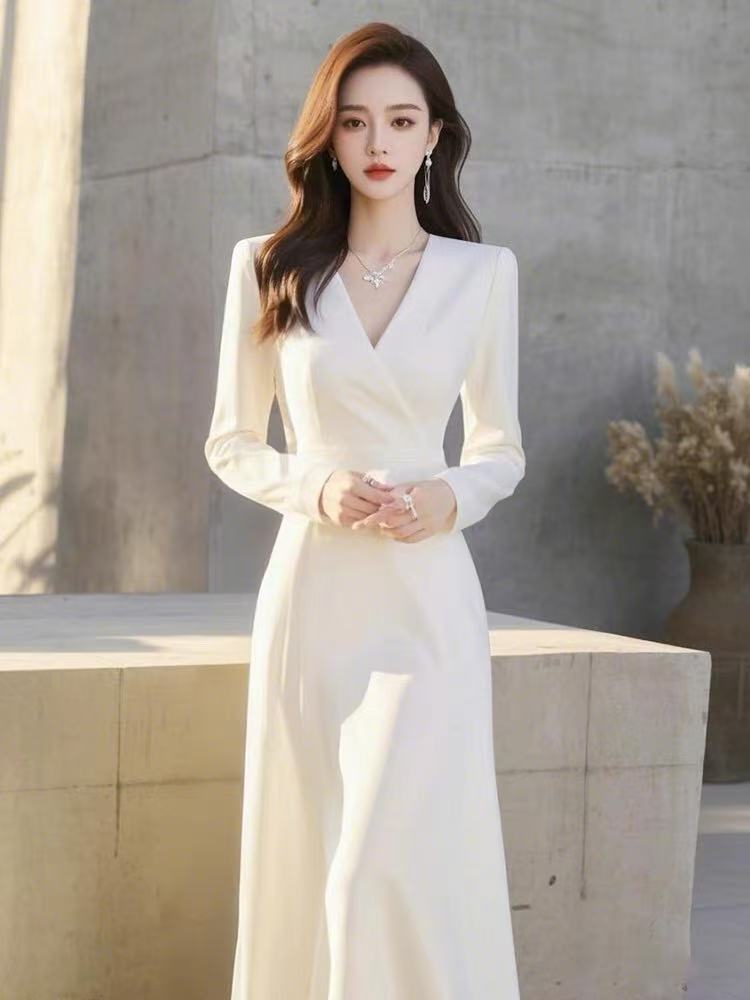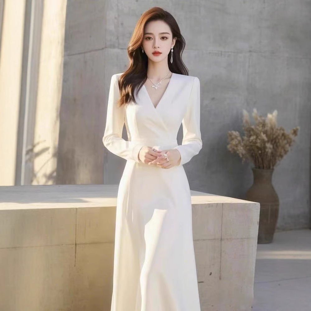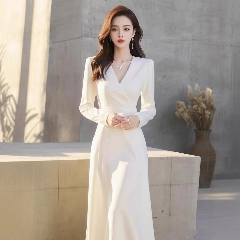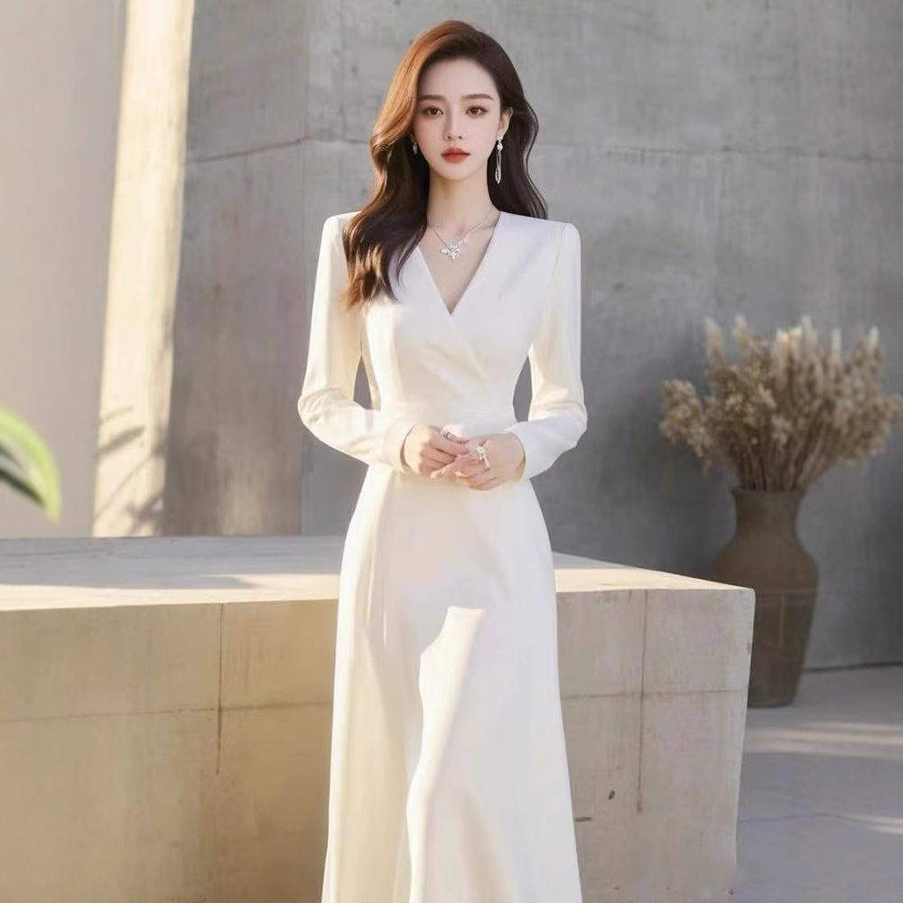 春秋の高級宴会のドレスの女神の範の長いスカートの高級感の端正な大気の超美しい白いワンピースの女性