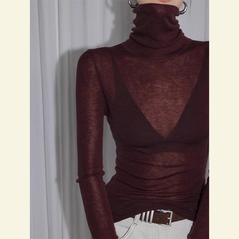 初冬时尚洋气修身显瘦高级感绝美高领微透长袖薄款针织打底衫恤