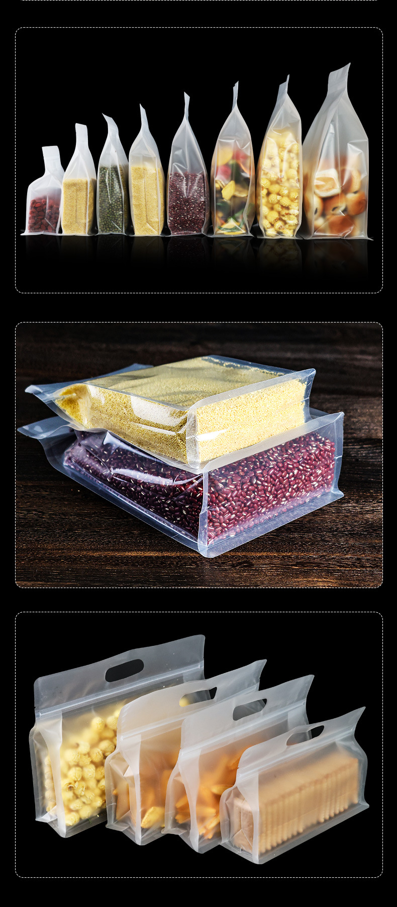 透明なつや消しハンドバッグ型自立式密封袋、八方シール、穀物食品用密封プラスチックハンドバッグ型包装袋