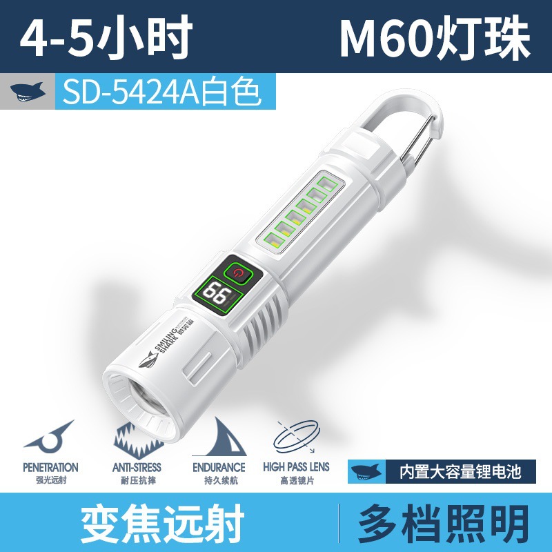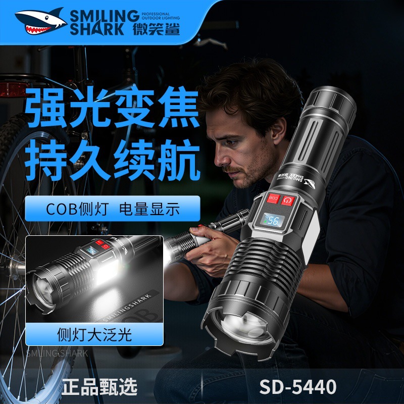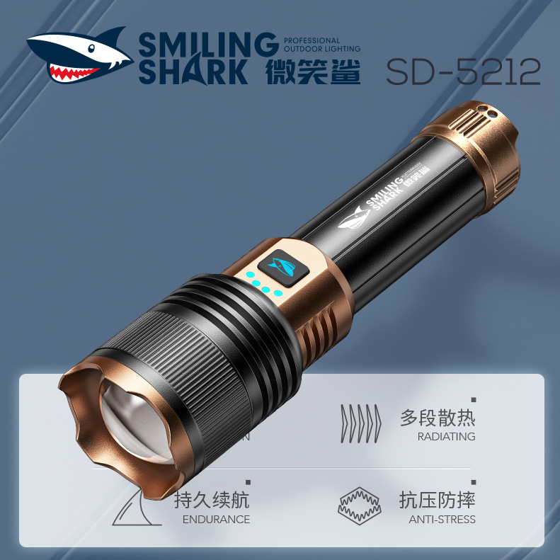 微笑鲨新款户外照明多功能手电筒强光超亮变焦远射充电持久续航