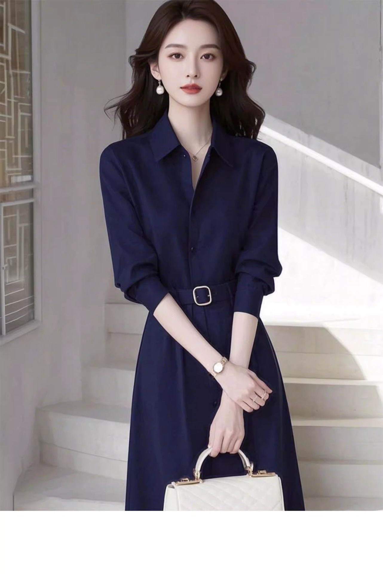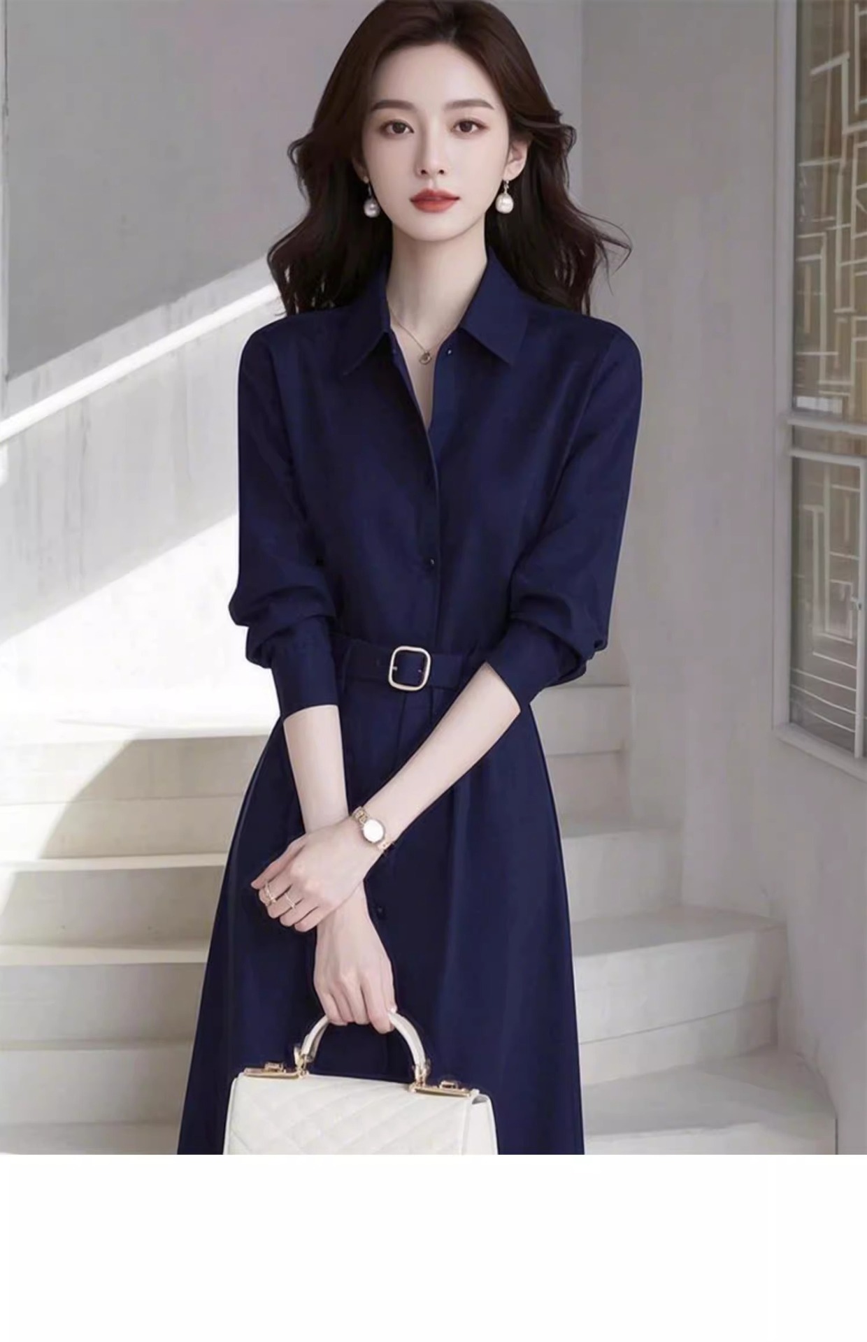 重要な行事に出席する際の上品な気質、高級感のある白いシャツワンピース、春の通勤スタイル