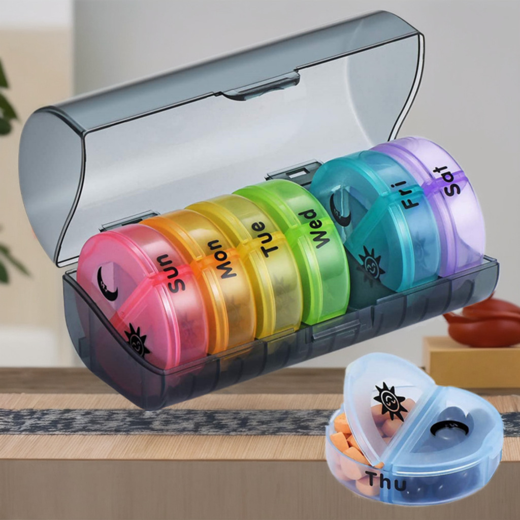 7日間ラウンドミニトラベル防湿14コンパートメントピルボックス、ポータブルで取り外し可能、毎週朝と夕方のプラスチックピルボックスに分割