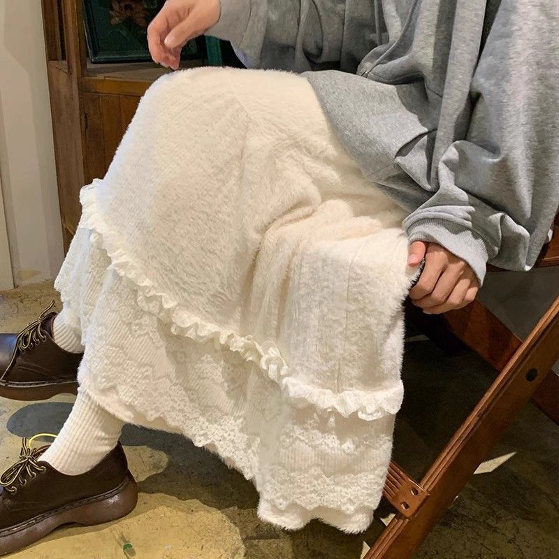 蕾丝拼接毛绒半身裙女2026秋冬季新款温柔风超仙气质a字蛋糕长裙