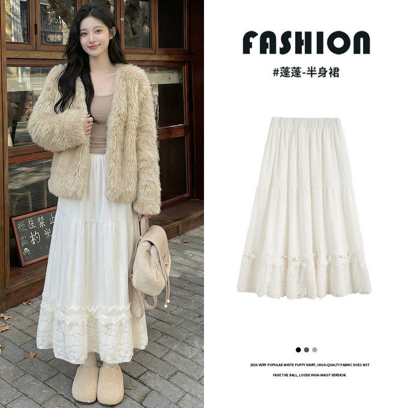 白色蕾丝蓬蓬半身裙女冬加绒加厚高腰a字大摆伞裙气质长款蛋糕裙