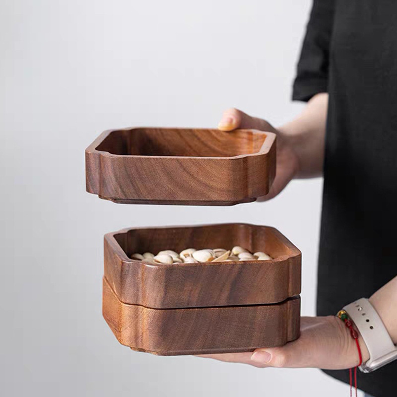 胡桃材のドライフルーツプレート、家庭用丸型ボウル、正方形トレイ、リビングルーム用スナックフルーツプレート、木製の質感、新中式