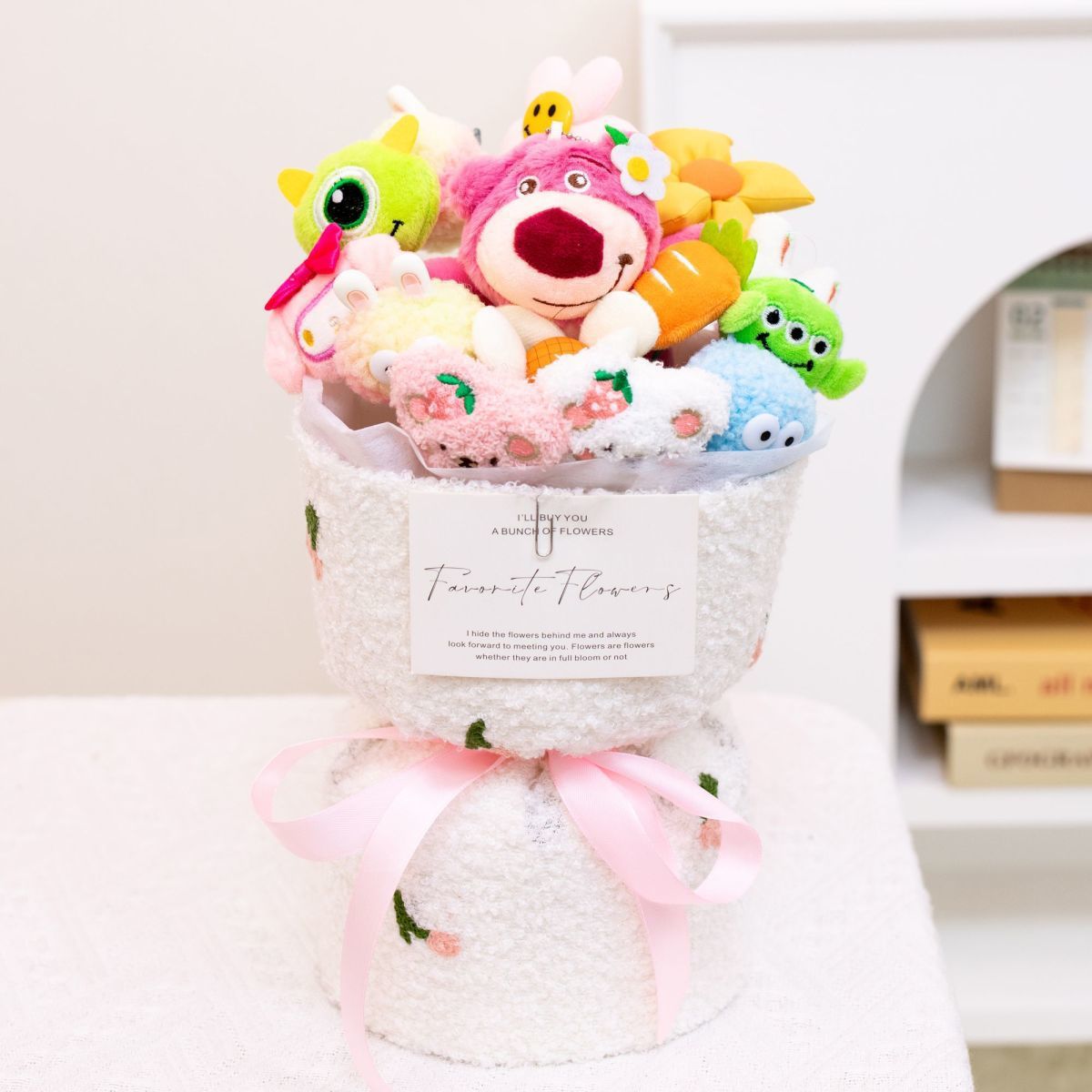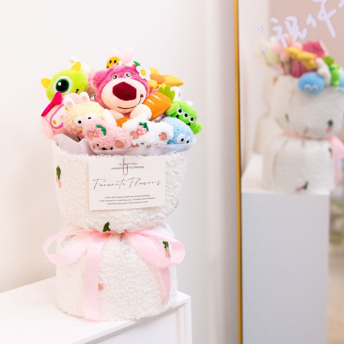 彼女の人形の花束をプレゼントします。女の子のぬいぐるみの誕生日プレゼントです。