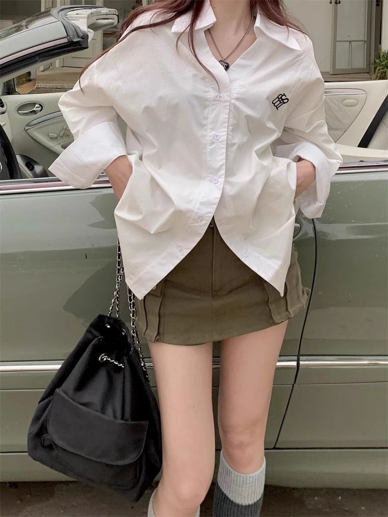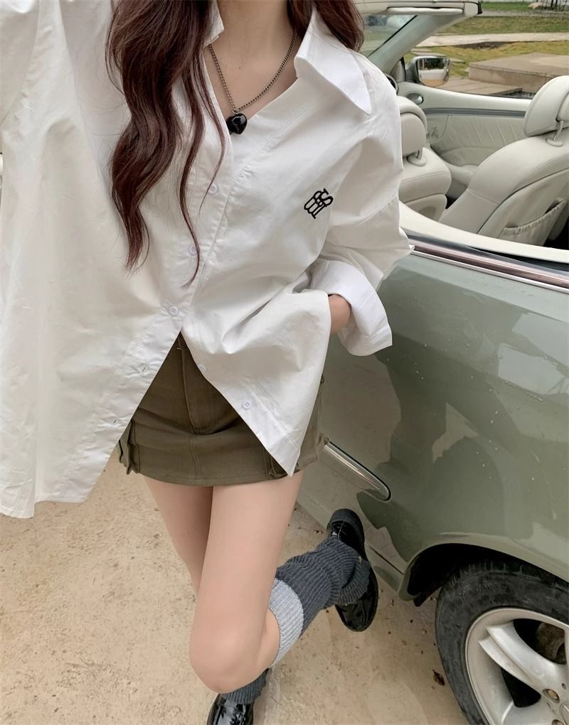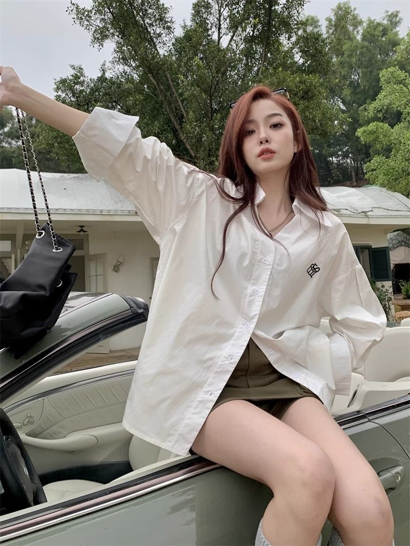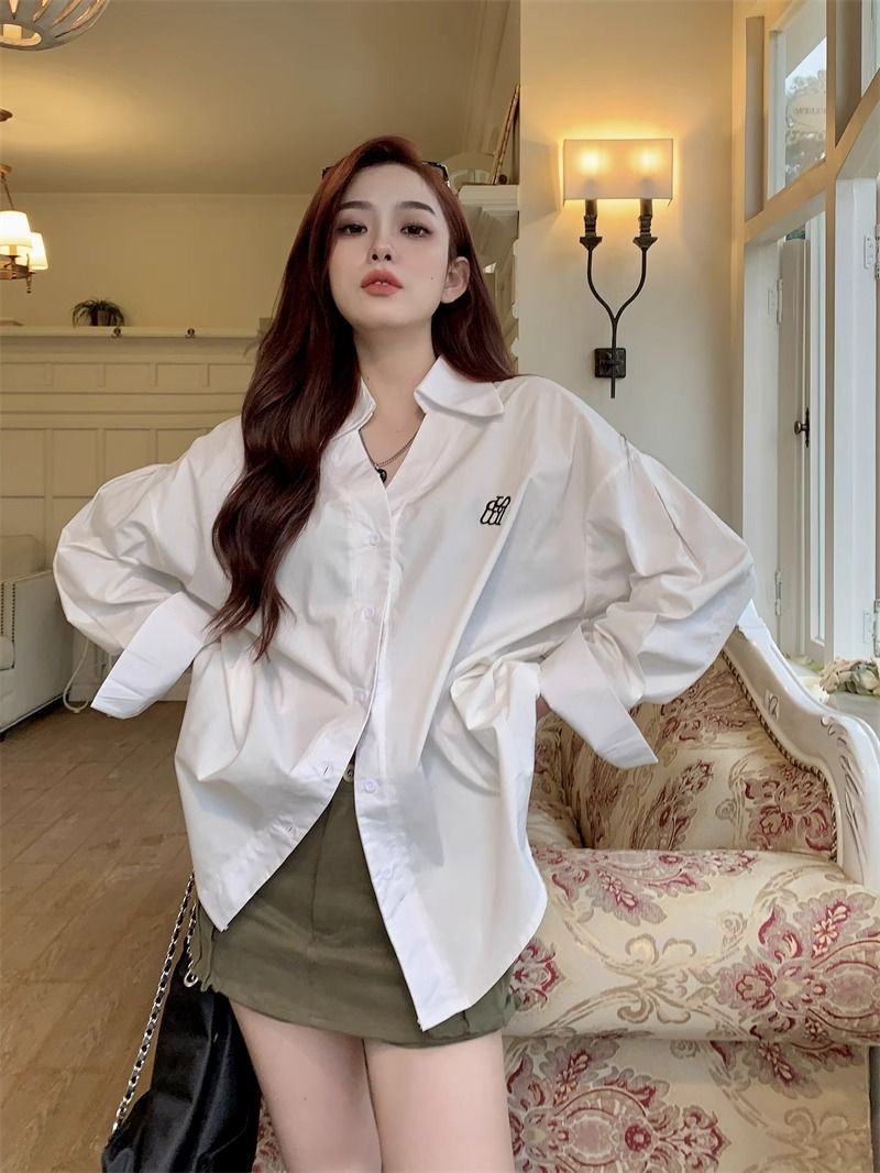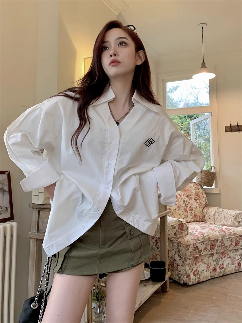 学院風刺繍長袖シャツ女性2025朝春秋新デザイン感高級刺繍韓国版ゆるいシャツ