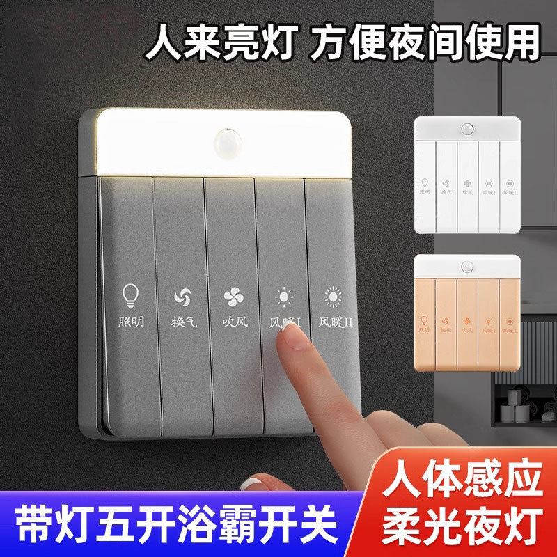 86型バスバー五合一通用スイッチホテルの家庭トイレ換気風暖スライド式防水スイッチ