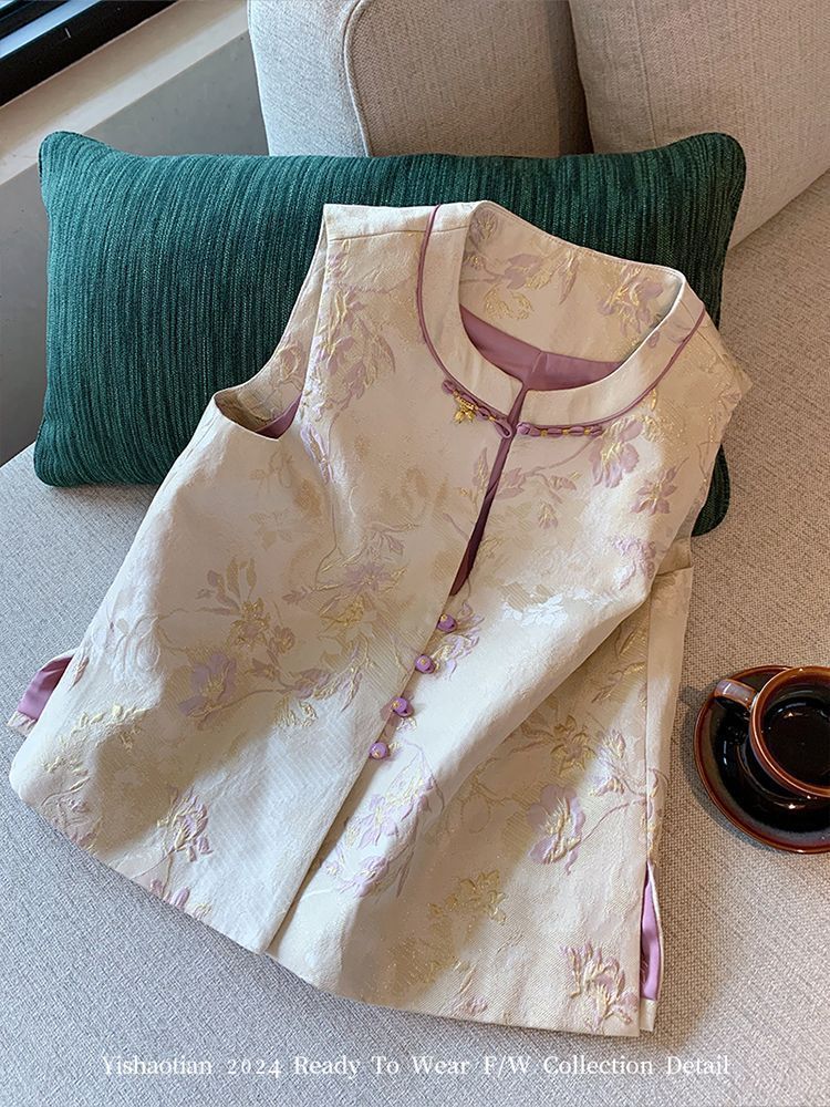 2025年の春の新型の新中国式のバックルの肩の上着の国風の馬の甲の婦人服の馬のベストの百合の袖なし