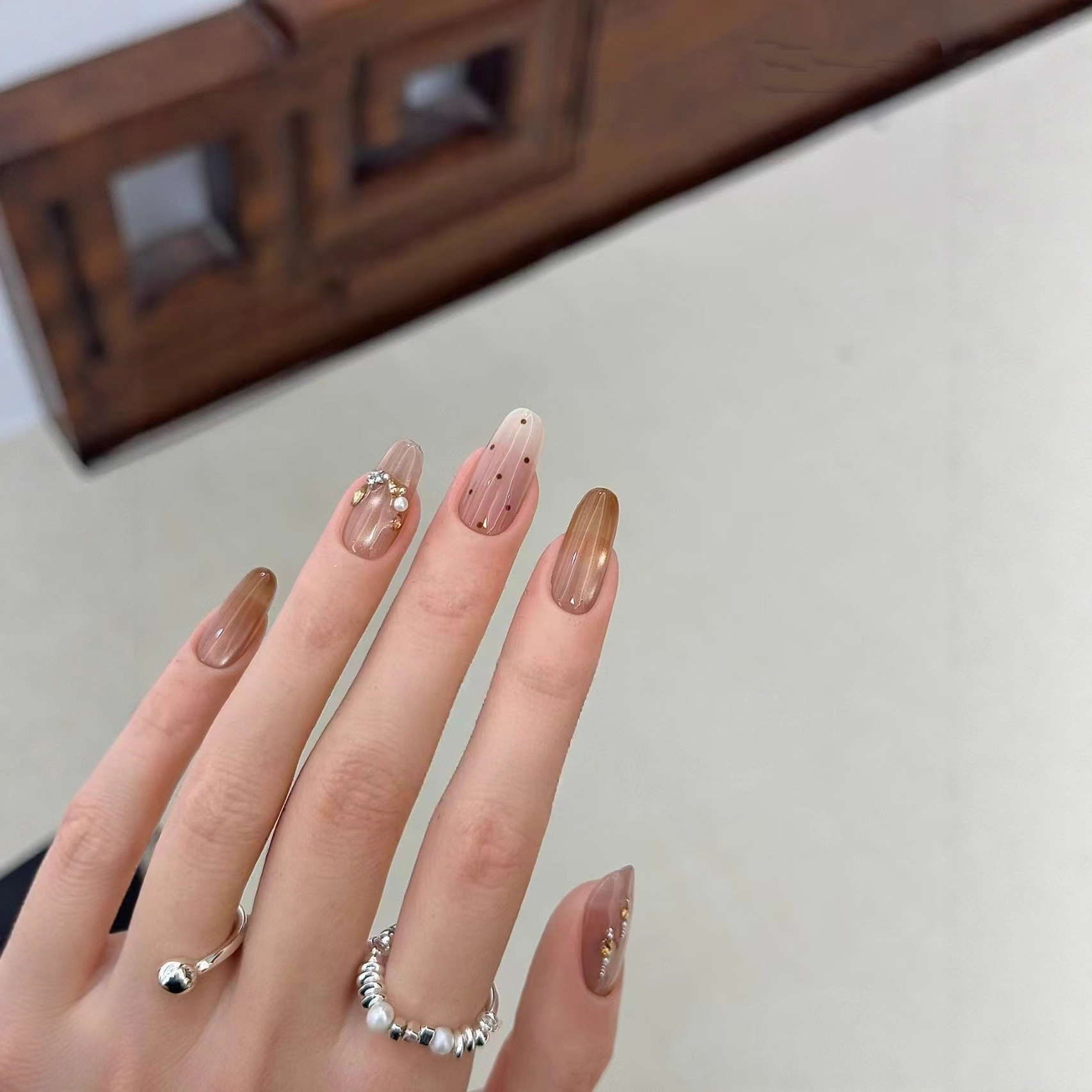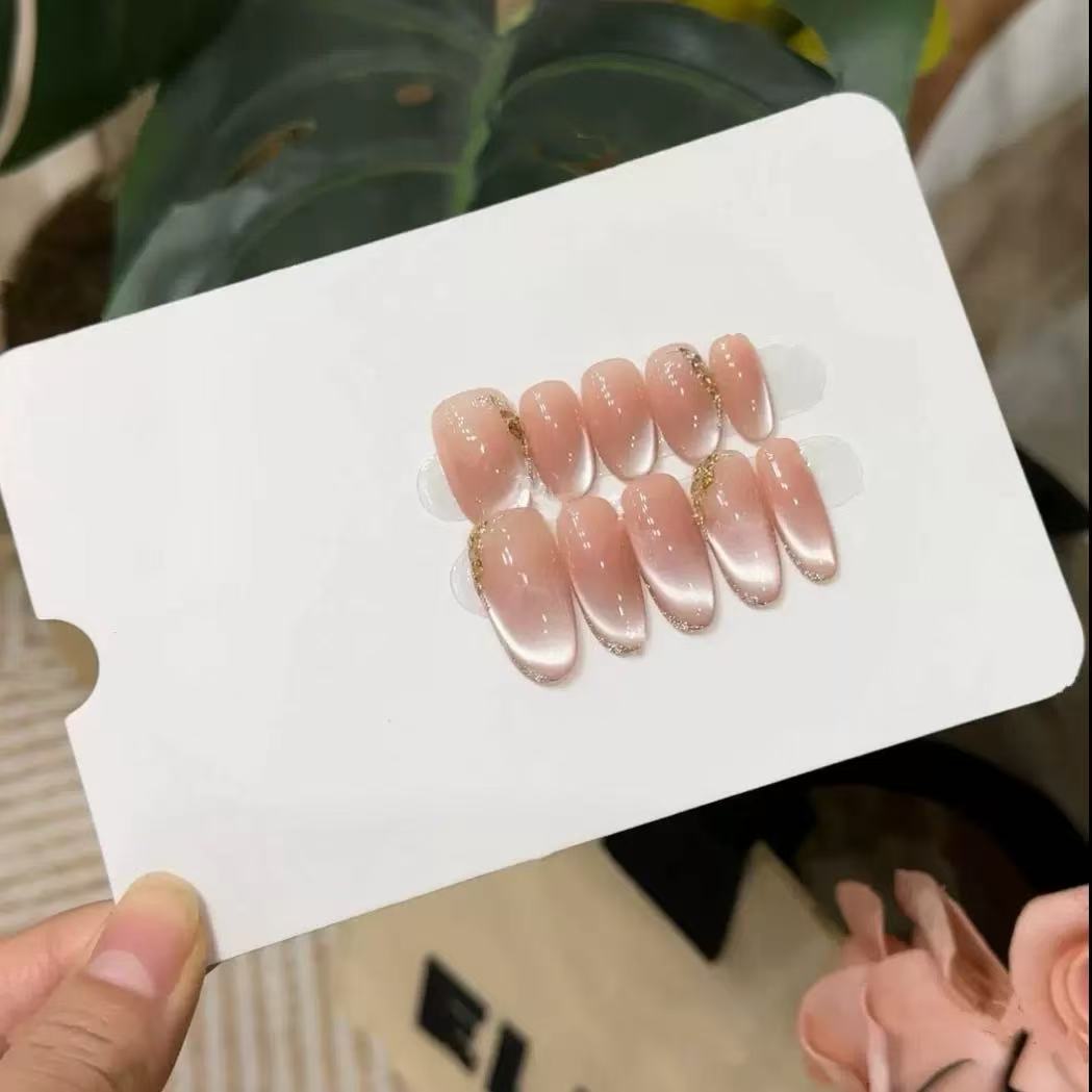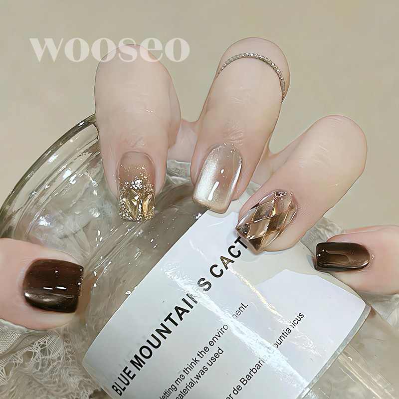 纯手工穿戴甲秋冬新款渐变金棕猫眼碎钻爆闪甲片简约风显白美甲贴