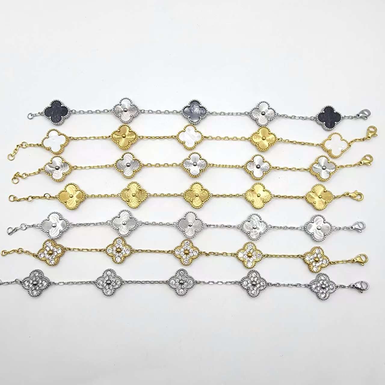 跨境钛钢高版本四叶草手链轻奢简约天然贝母镭射五花百搭手链批发