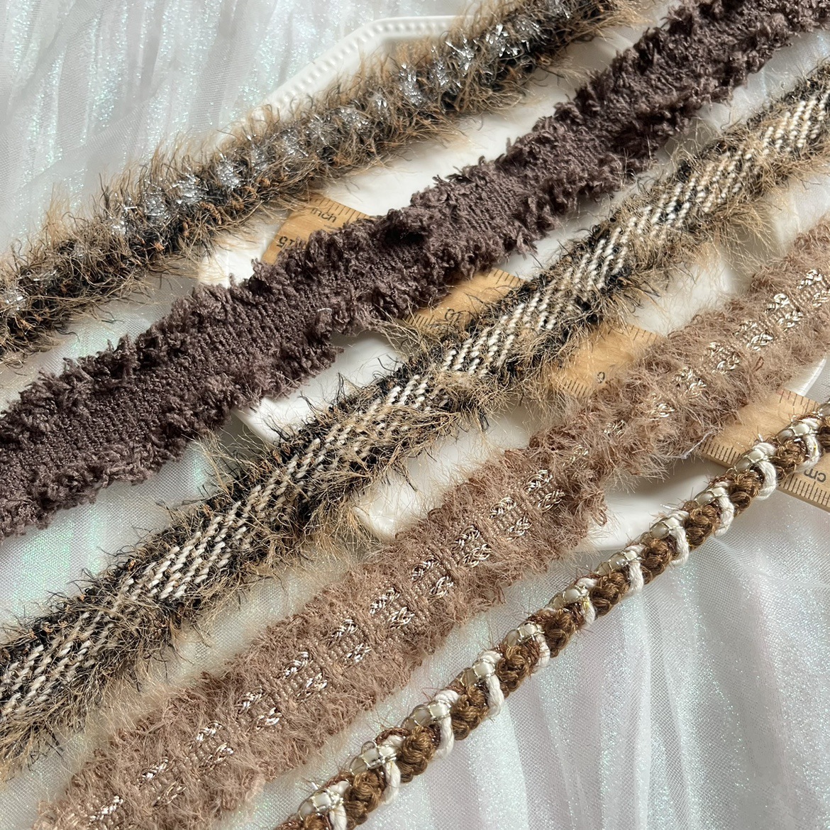 小香風の毛羽立ちのある花柄レース、秋冬新作、メイラードカラー、キャメル、コーヒー、ブラウン系の服飾材料、縁取りテープ