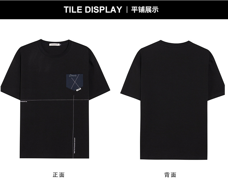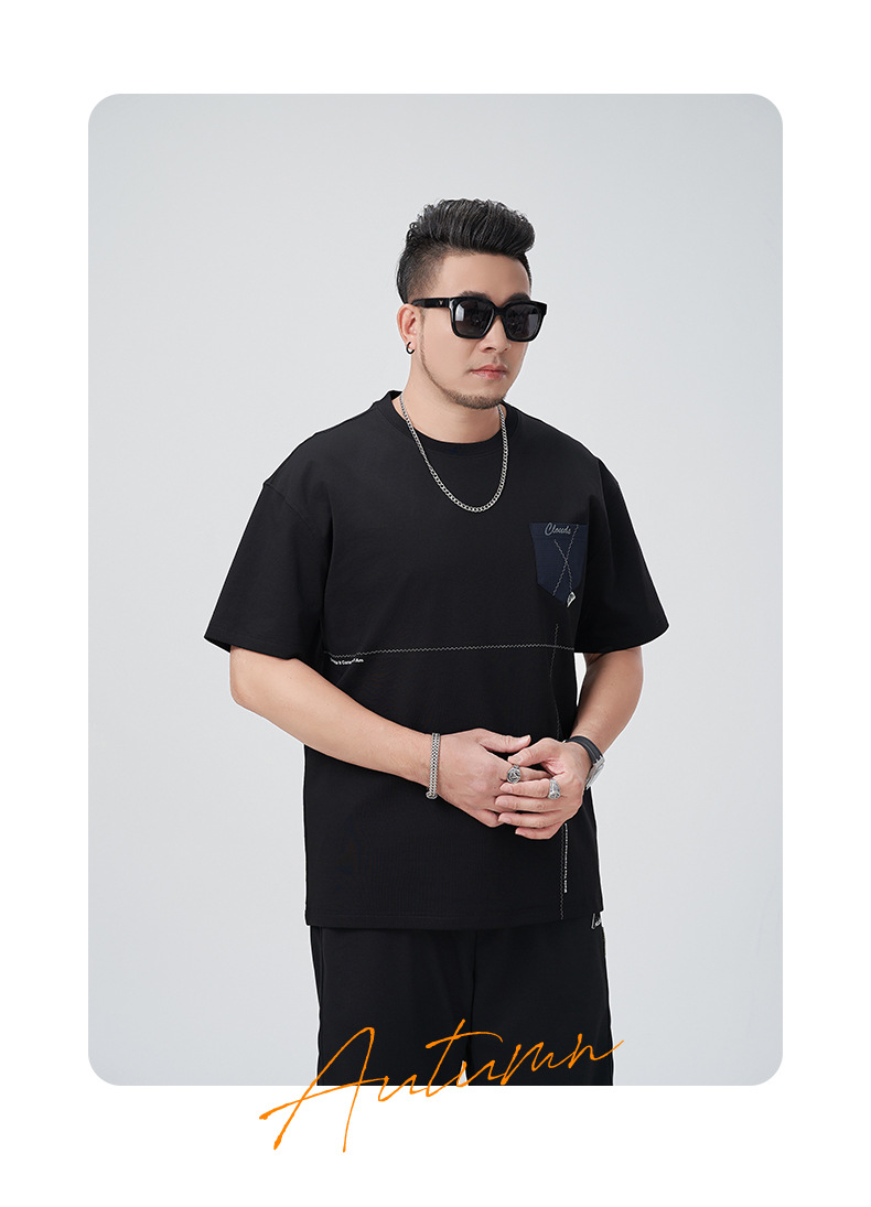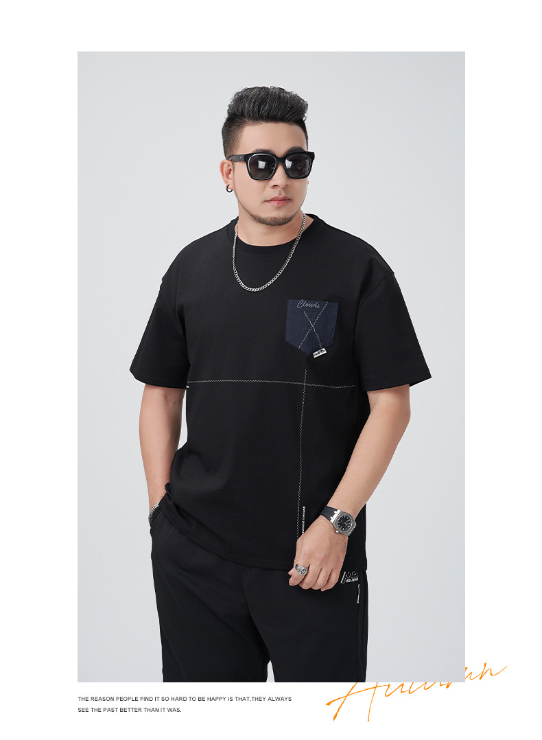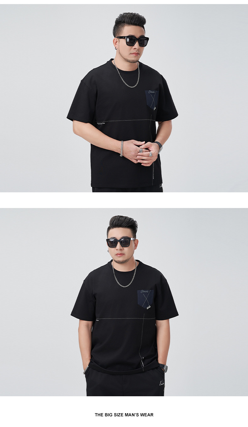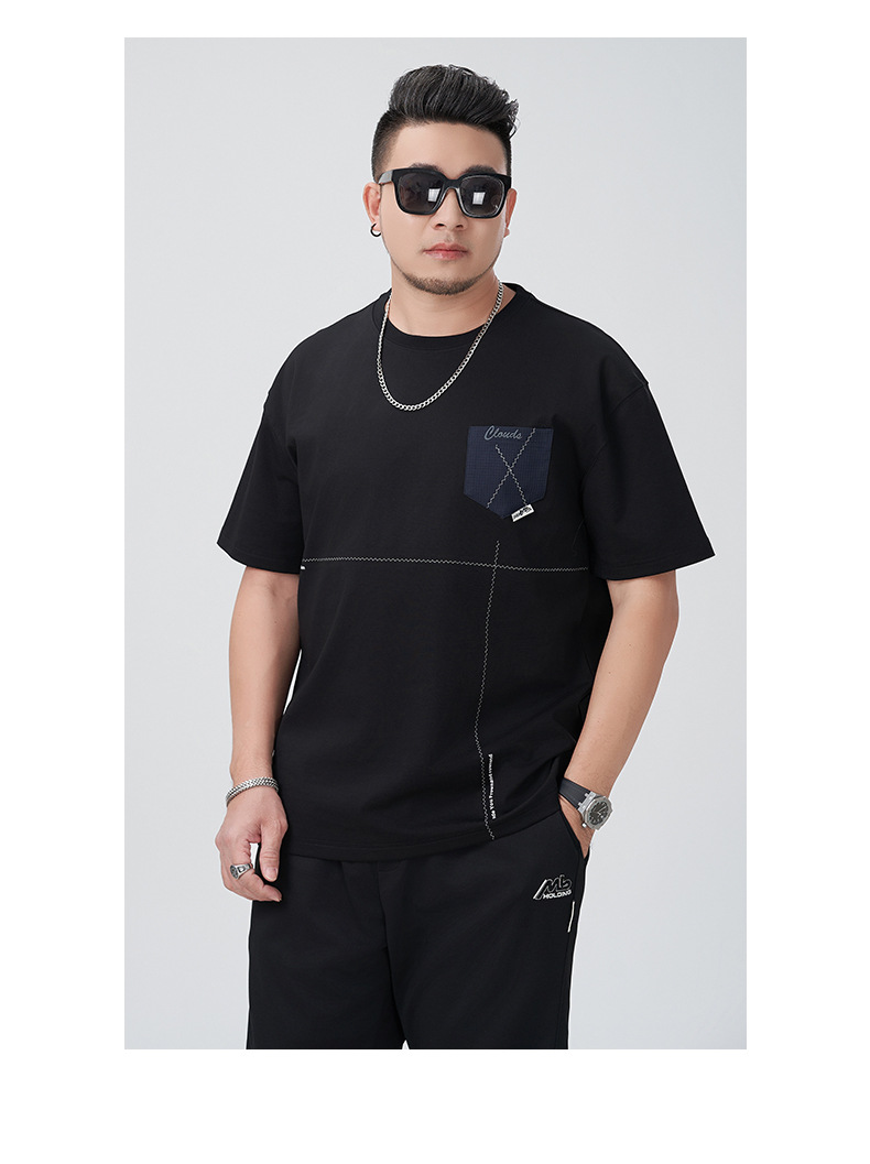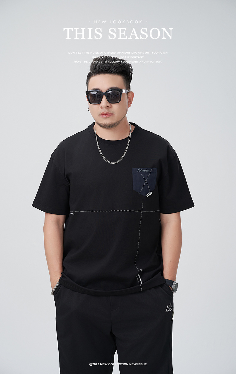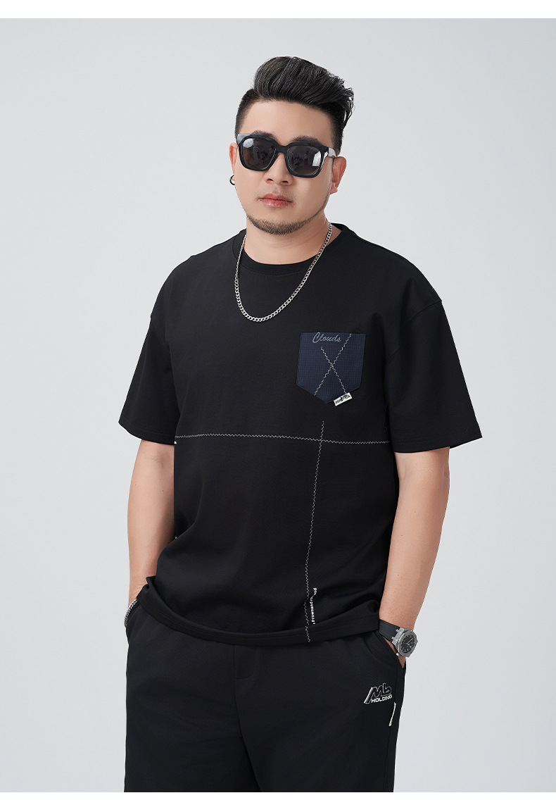 プリント半袖Tシャツ | 大きいサイズのメンズ服卸売、越境EC向け、夏の新作、ドロップショルダー、パッチポケット付き、ゆったりとした半袖メンズ
