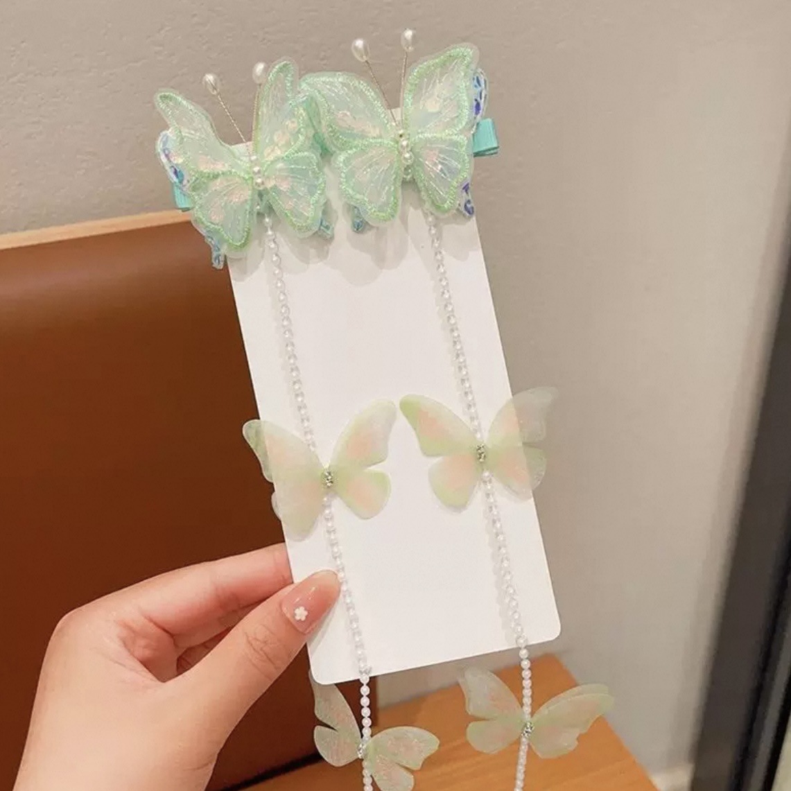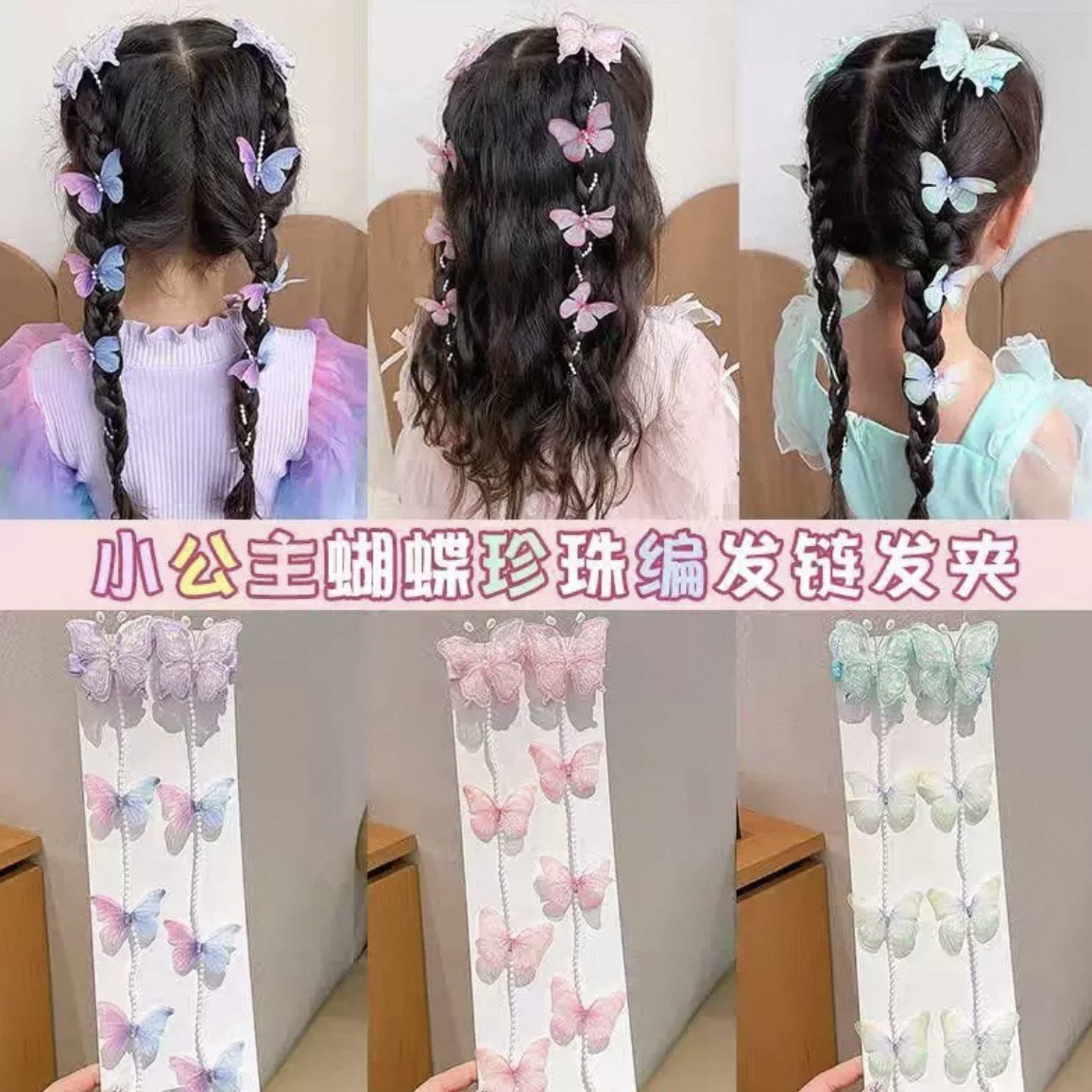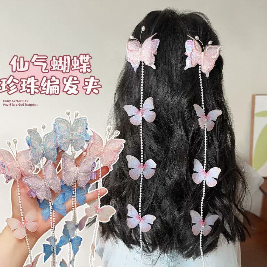 子供用真珠蝶編み髪チェーンヘアクリップ超仙古風ヘアピン甘いフリンジ編み髪ひもお姫様ヘアアクセサリー