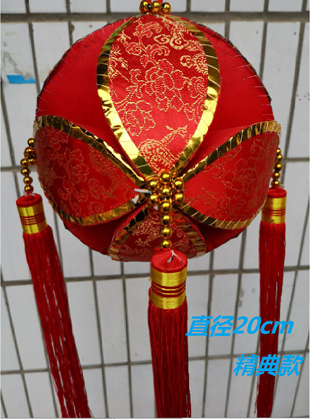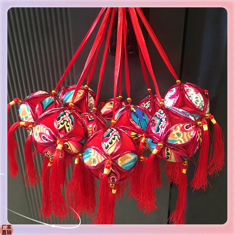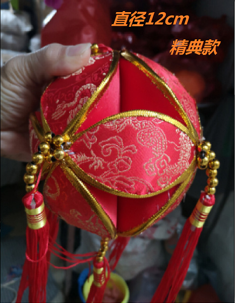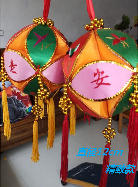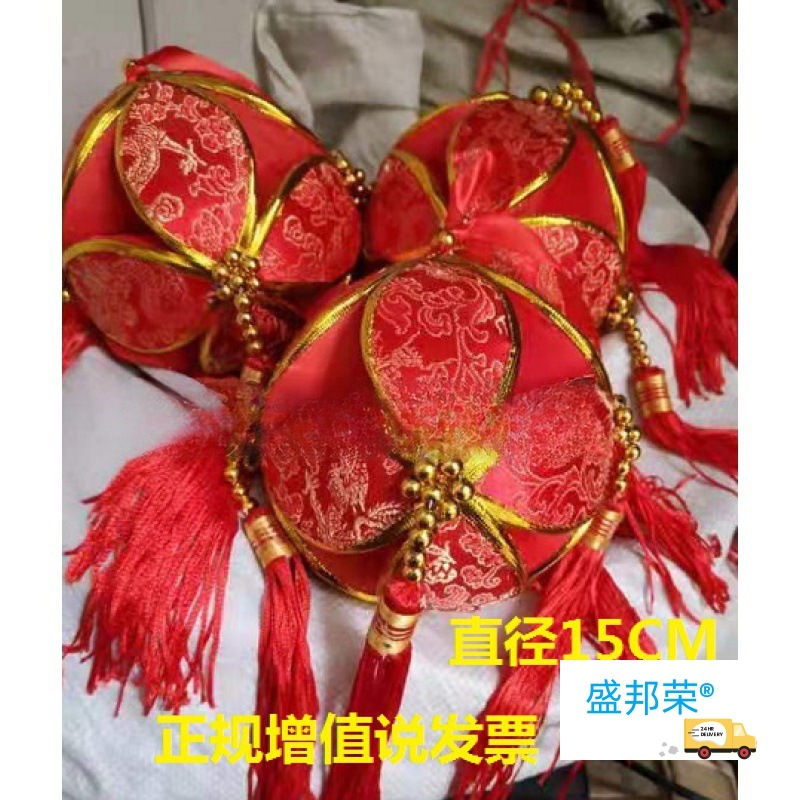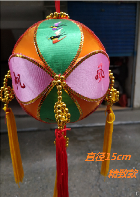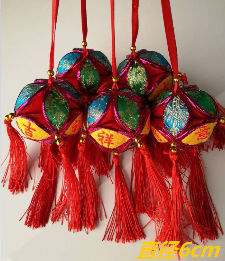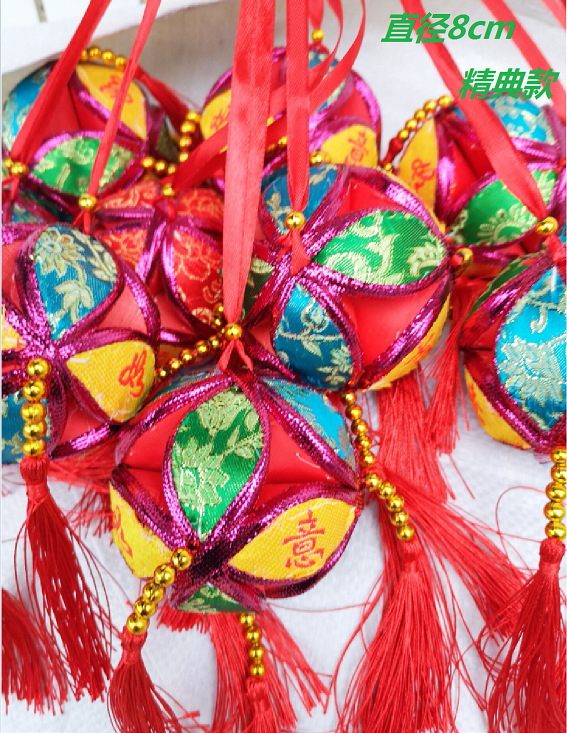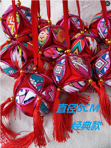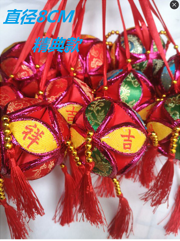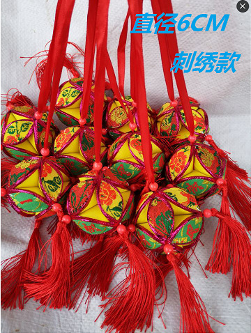 材料:外层(刺绣图案,绣球的表面)为浆绸缎,内填充物为包裹好的大米等颗粒物。