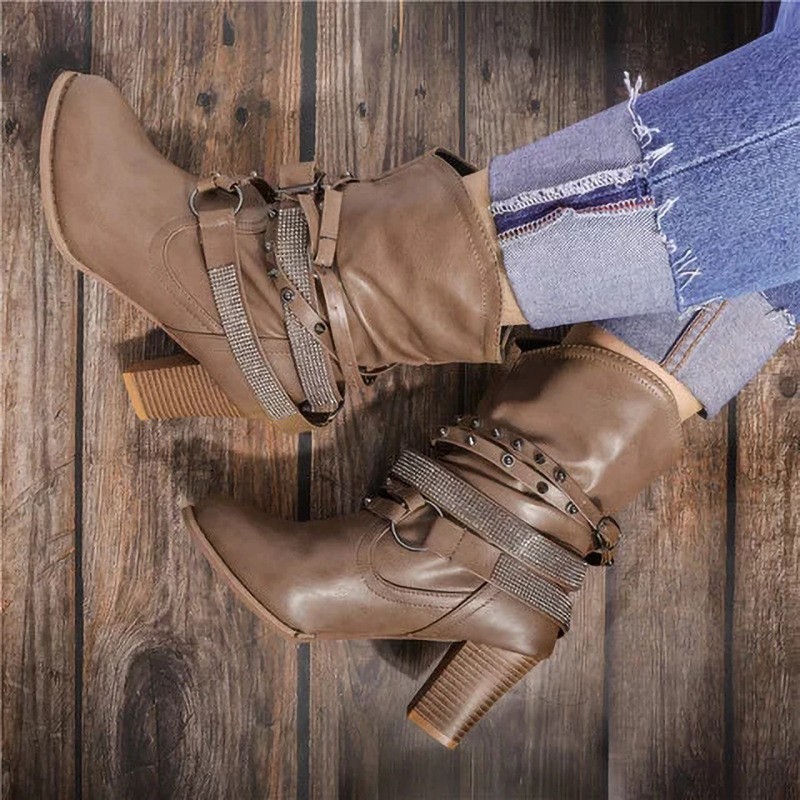 2026秋冬外贸款欧美时尚女靴鞋子粗跟高跟圆头短靴铆钉水钻女靴子