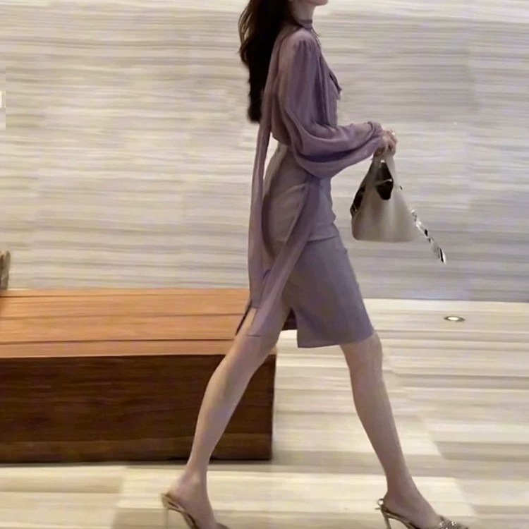 韓国版chi春秋フランスレトロ気質減齢セクシーストラップワンピースシャツコート2点セット女性