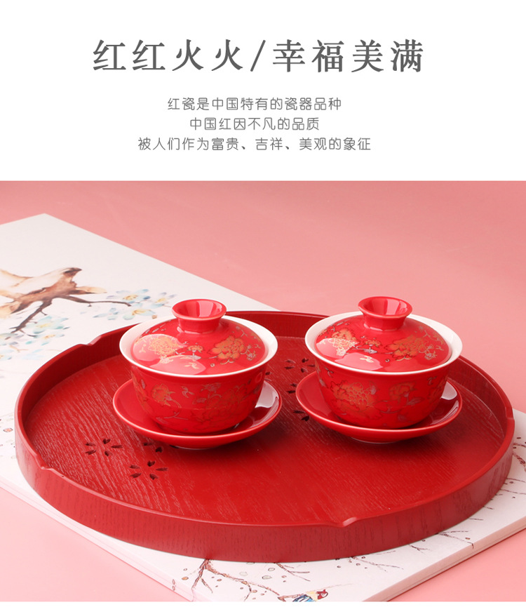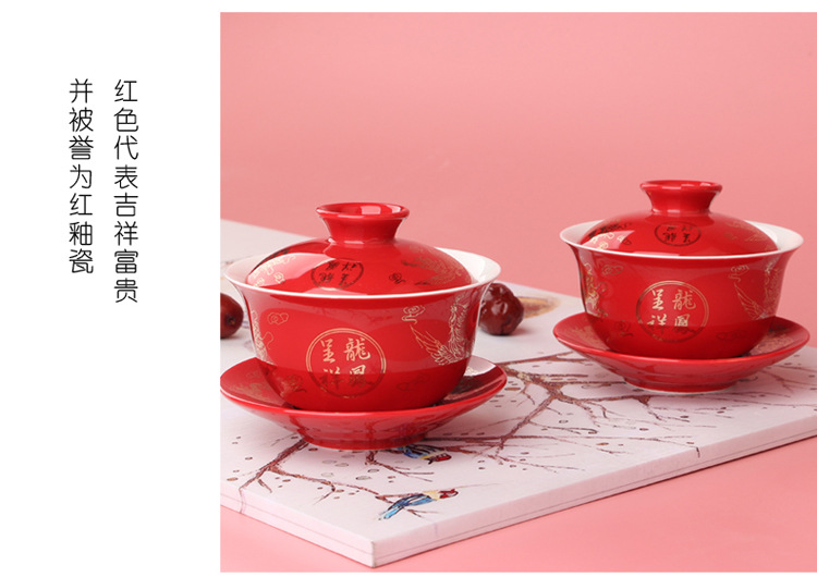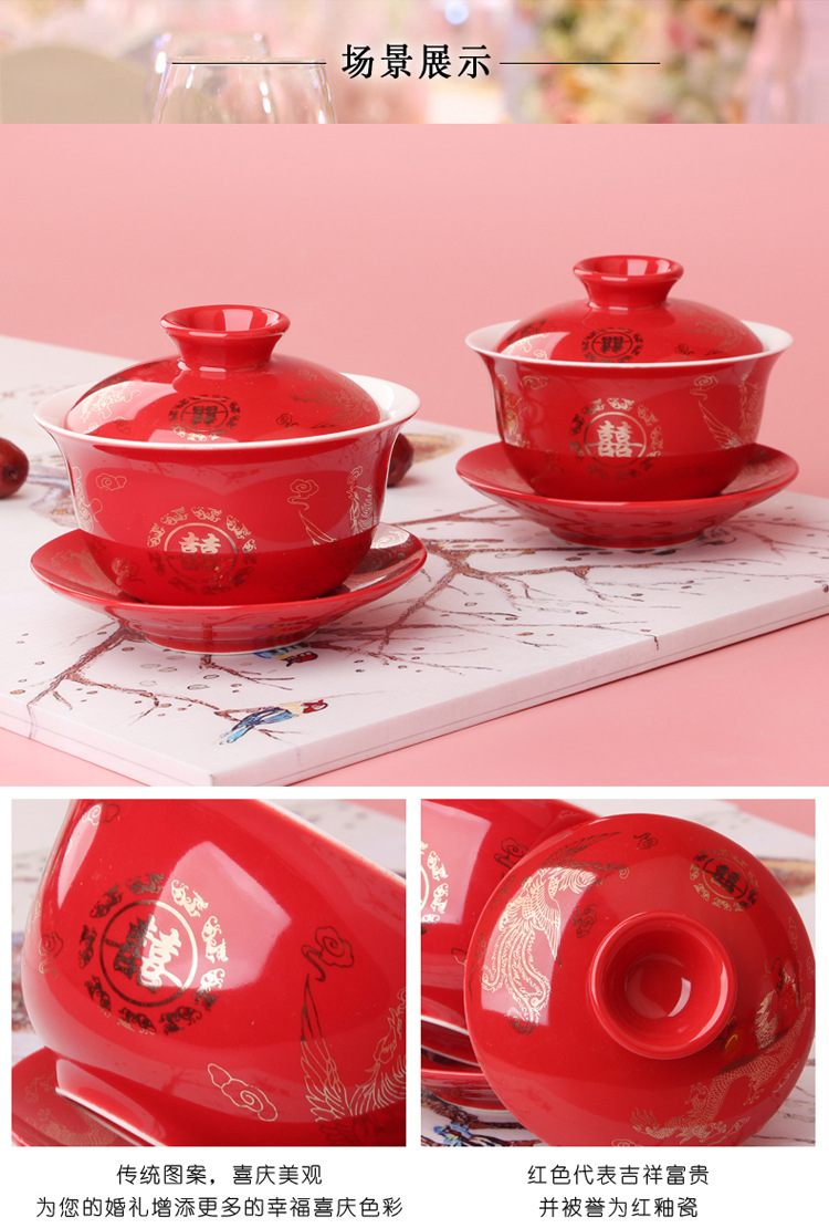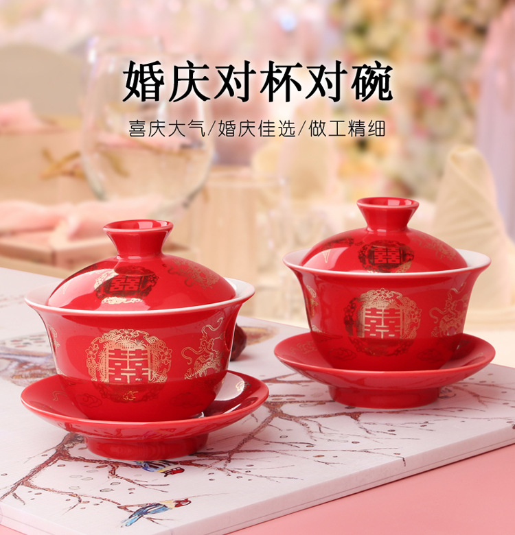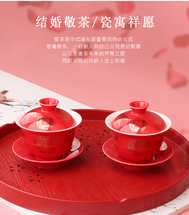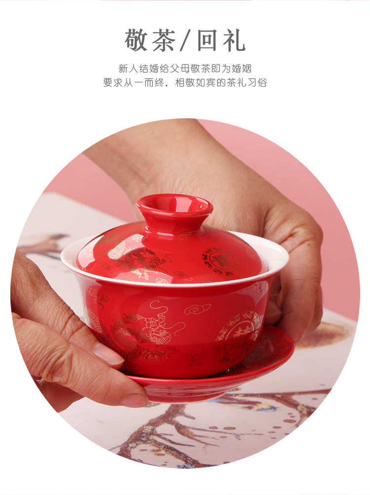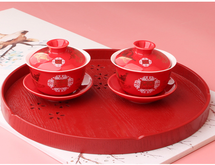 赤い結婚祝いの結婚式はお茶の杯の杯の杯の3才の碗を献上します。