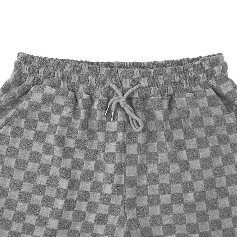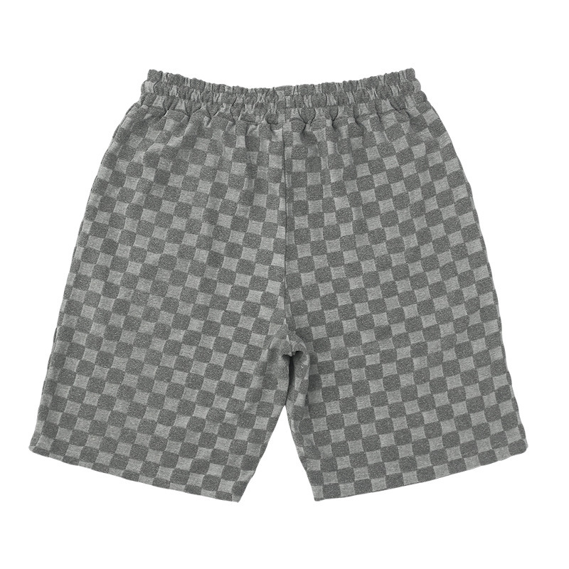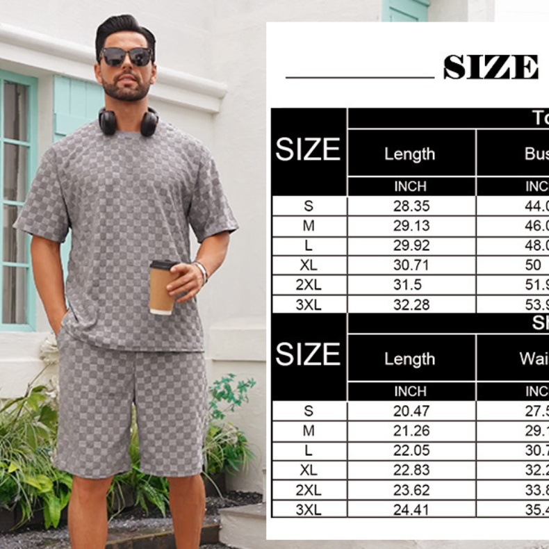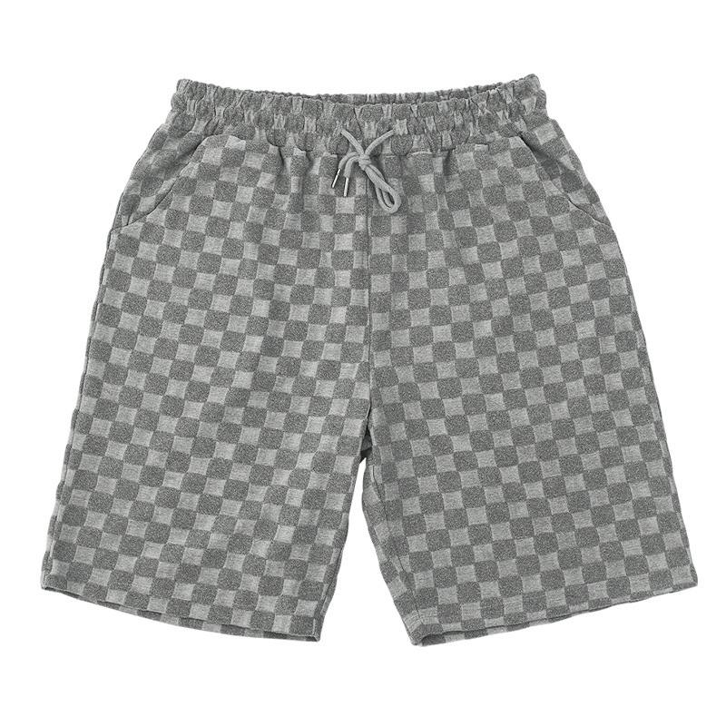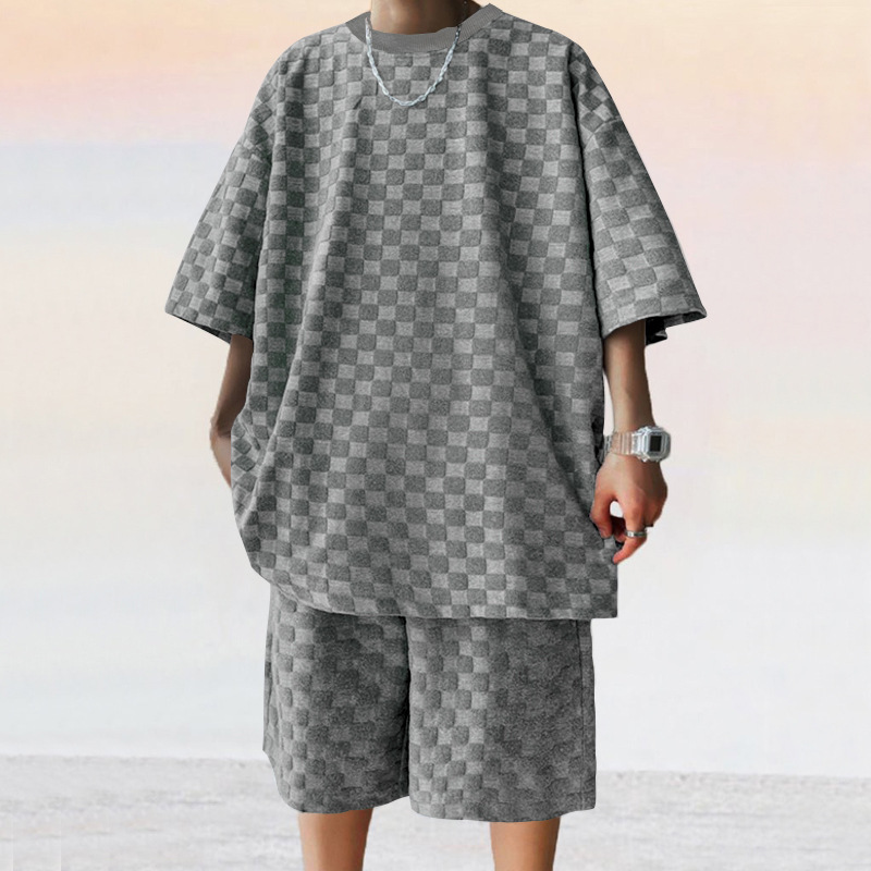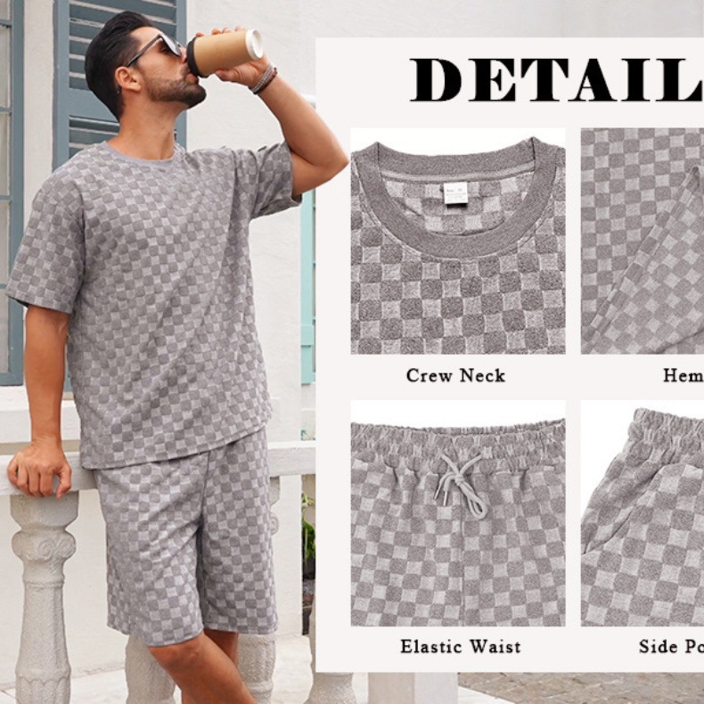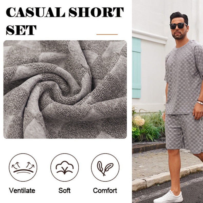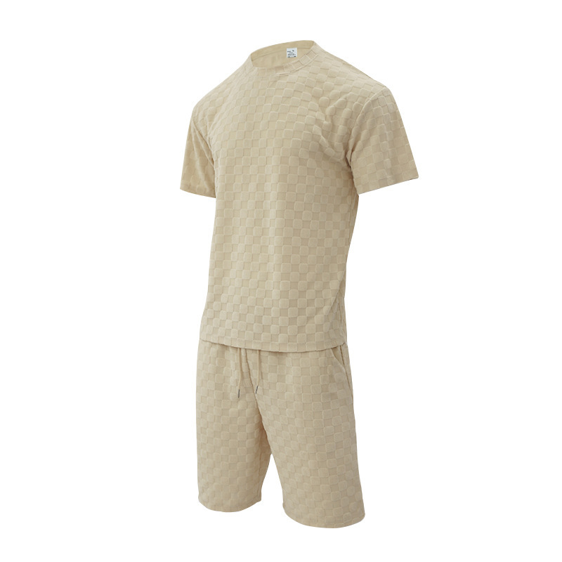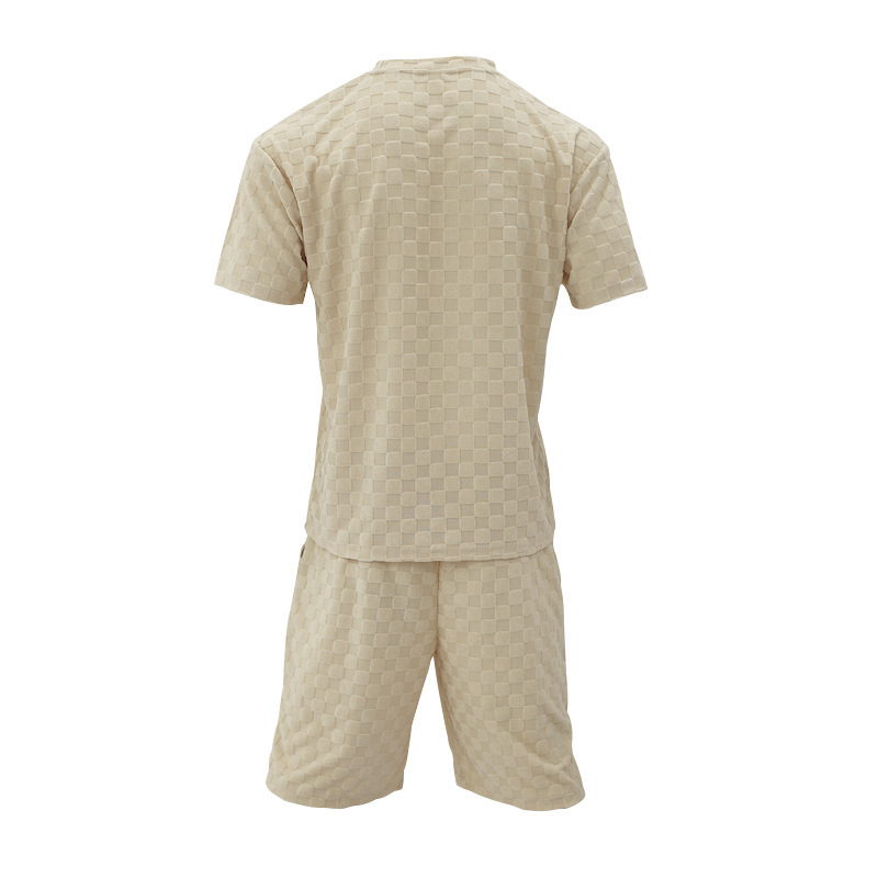 欧美跨境男装夏季毛巾提花布男式格子衫短袖短裤两件休闲运动套装