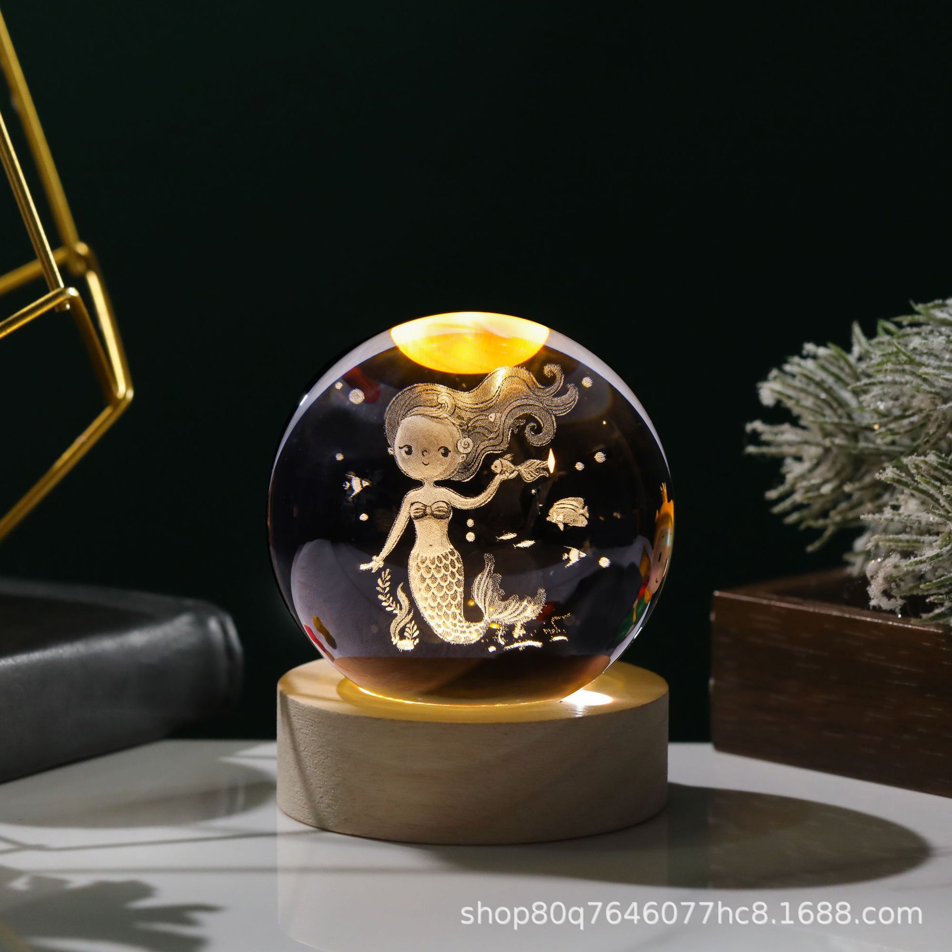 クリスタルボール内彫り発光ナイトライト、クリエイティブな卓上装飾、木製台座付き、ホリデーギフト、越境卸売