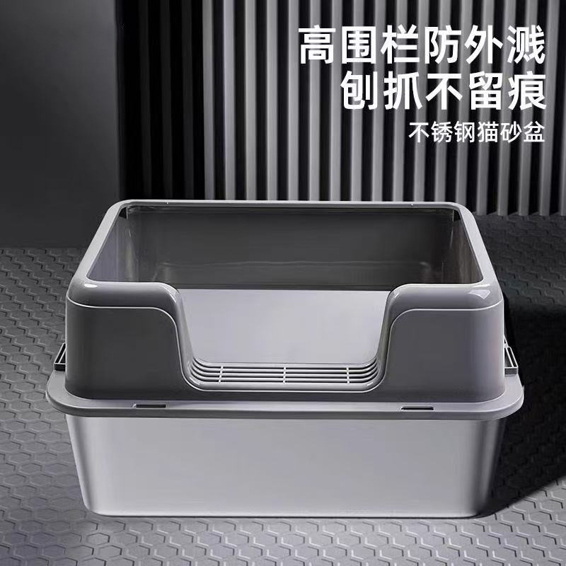 不锈钢猫砂盆开放式猫砂盆高围栏超大号防外溅加深半封闭猫厕所