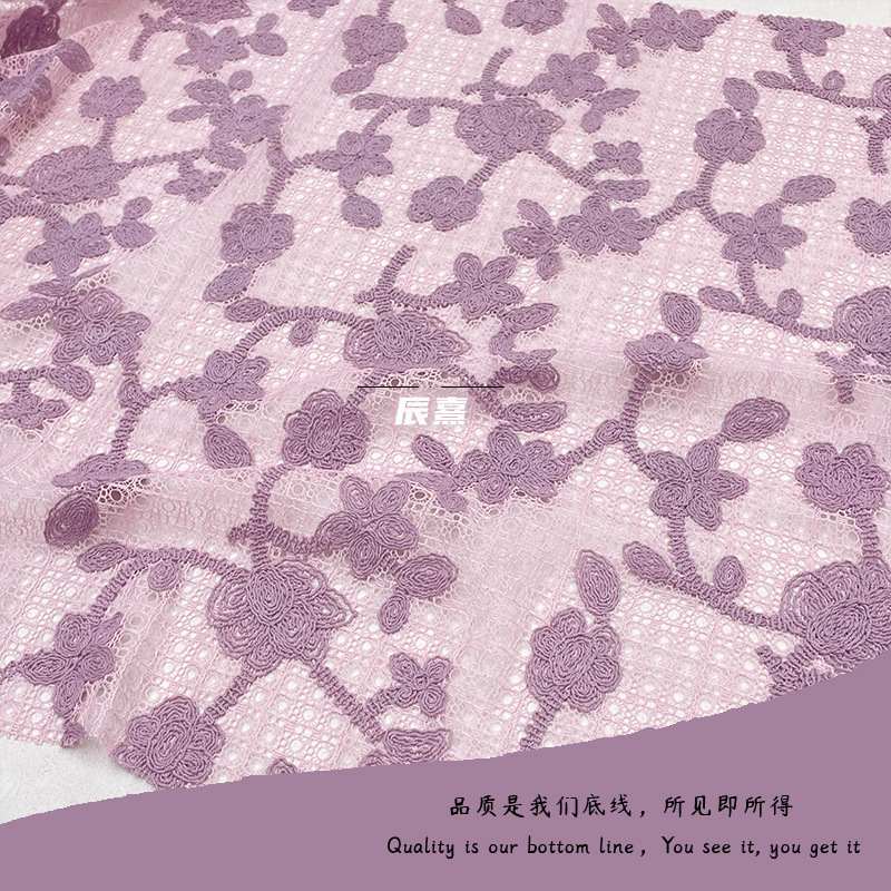 綿糸刺繍レース生地ピンクと紫のミディドレスレースカーディガン生地ファッションキャットウォーク衣類生地