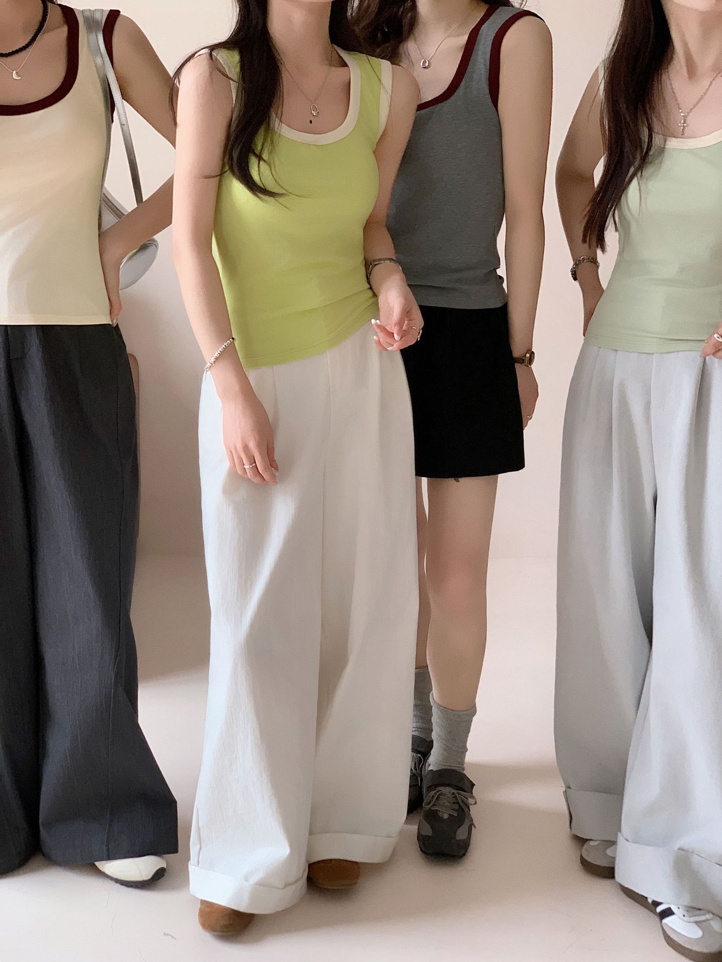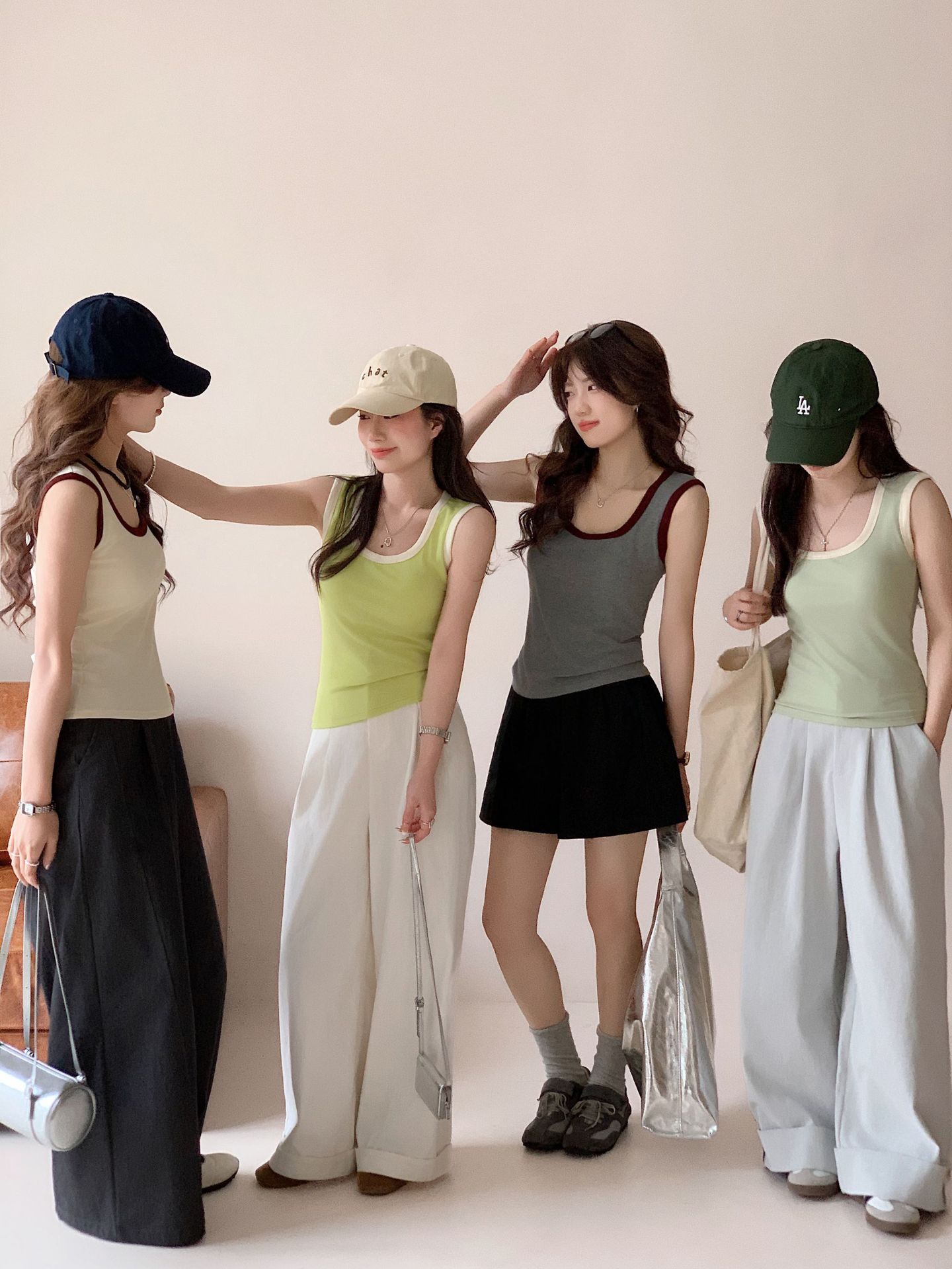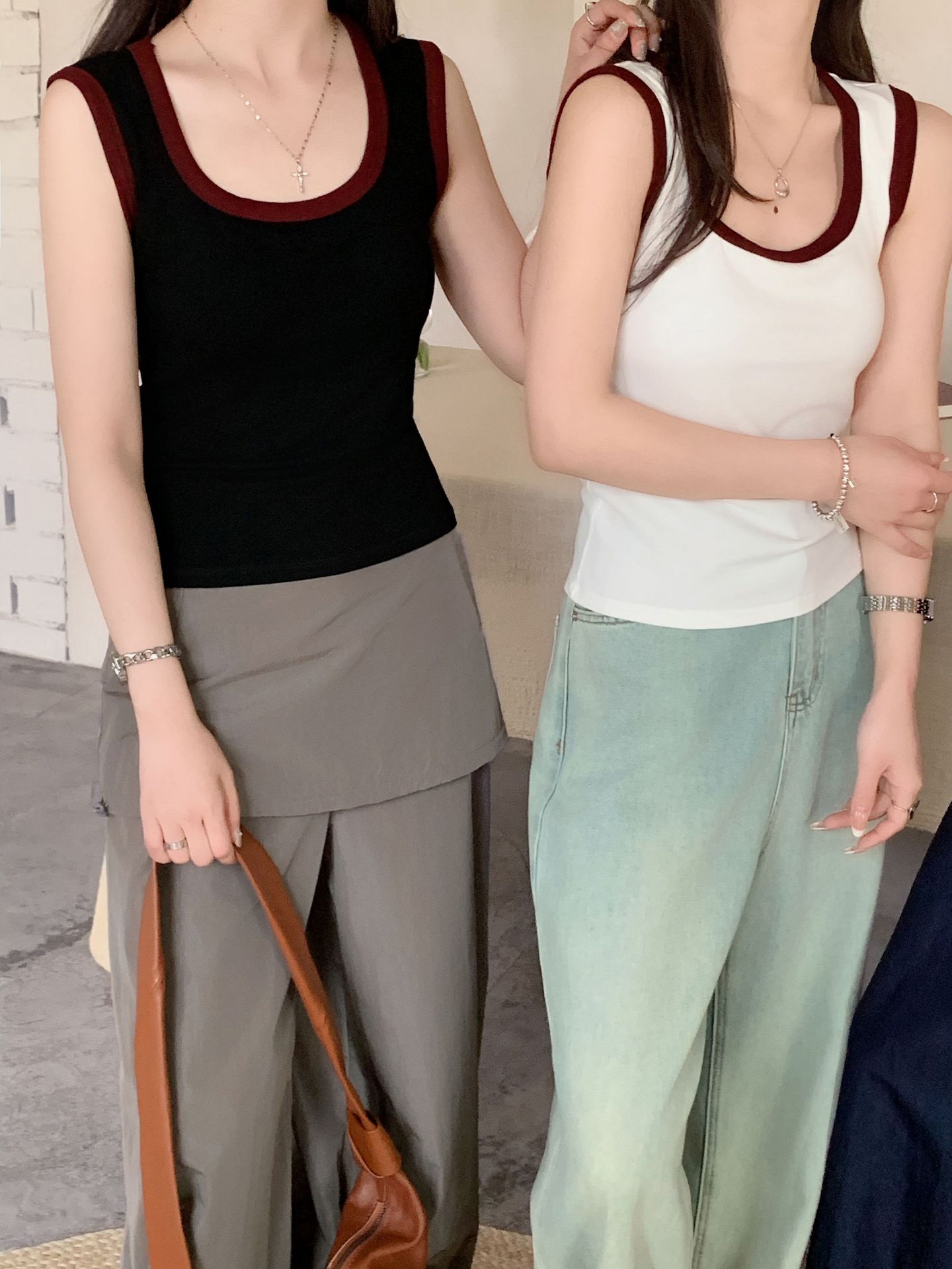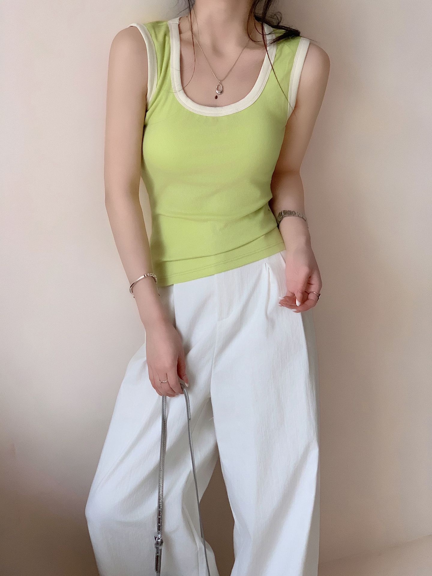 コントラストカラーのアウターウェアで着痩せ効果、インナーウェアとしても使える、胸パッド内蔵、スクエアネック、幅広ショルダーストラップで脇肉をカバーするトップス、キャミソール、高伸縮性でスリムフィット。