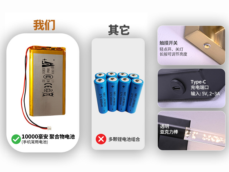 クロスボーダー爆金充電金無配線壁灯長尺航続三色調光創意装飾壁灯源工場