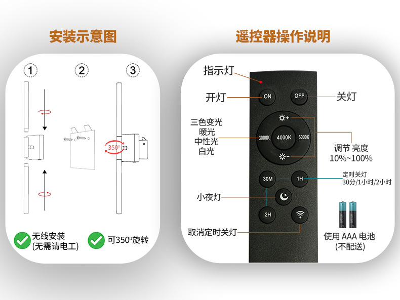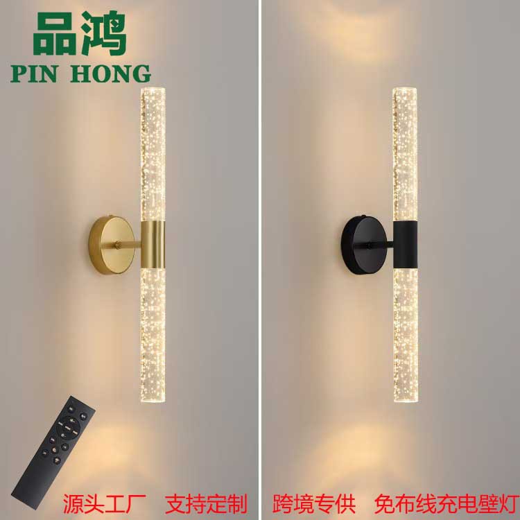 クロスボーダー充電電池無配線壁灯寝室客間長尺航続リモコン三色調光源工場