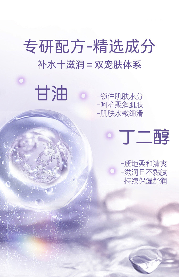 【功效】精华水漾质地,能有效被肌肤吸收,清莹舒适;内含植物精粹,持续保湿,使肌肤保持细腻润泽。