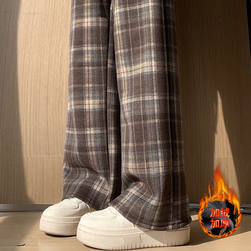 格子裤女加绒加厚秋冬季高腰垂感宽松直筒裤休闲羊羔绒阔腿裤2025