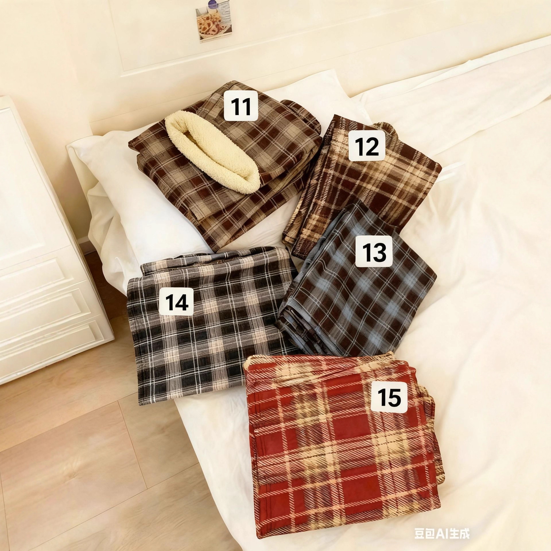 羊羔绒格子裤女秋冬季加绒裤子东南亚高腰阔腿裤复古直筒休闲裤