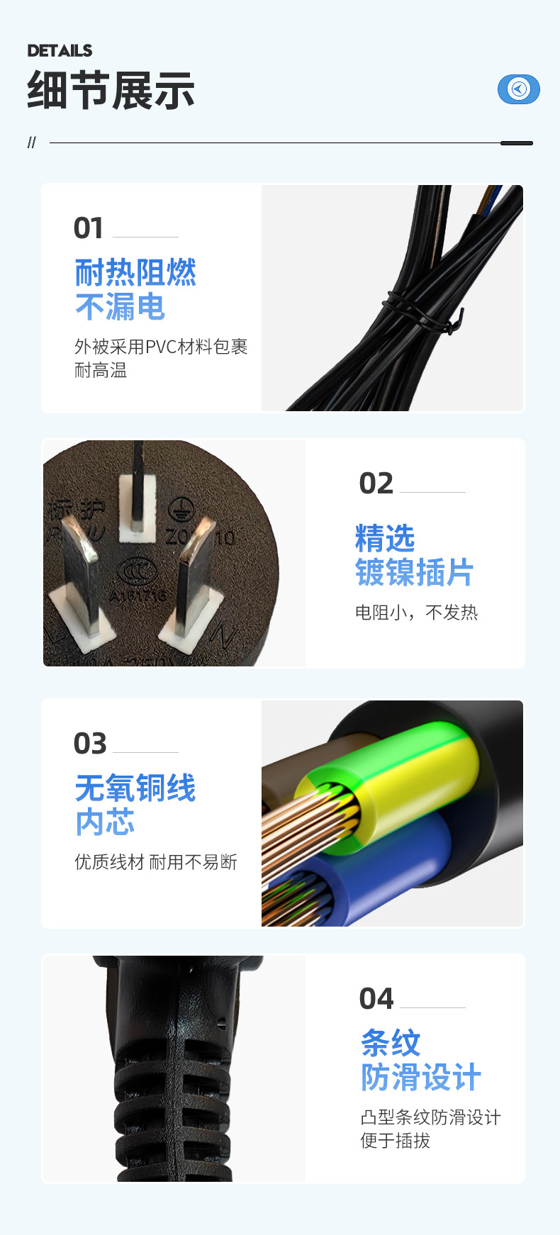 国家規格純銅3芯電源コード、3ピン品字型プラグ、3C認証、3穴プラグ、耐熱性、高温耐性、安全で耐久性があります。